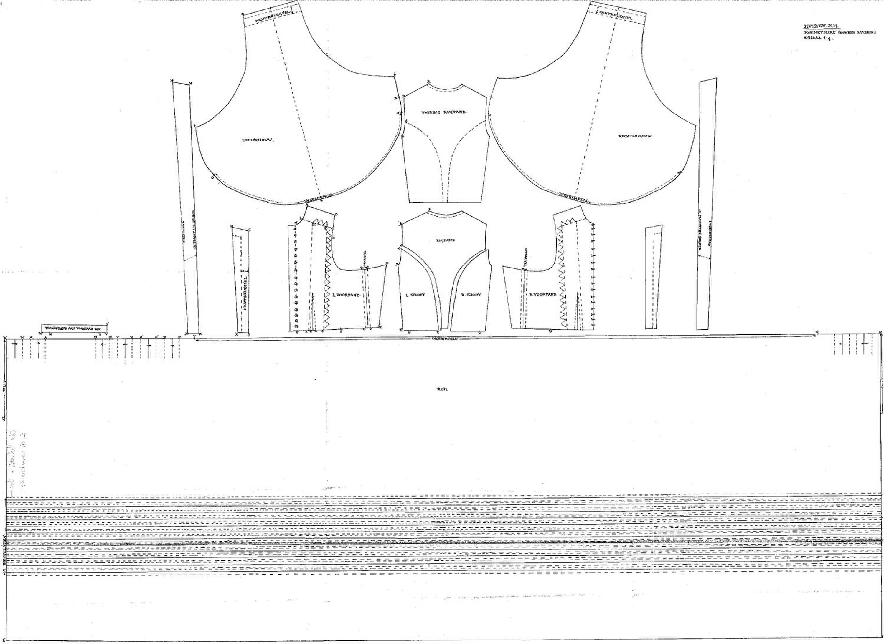 Patroontekening van een kornetjurk, gedragen door een vrouw. Schaal 1:4.