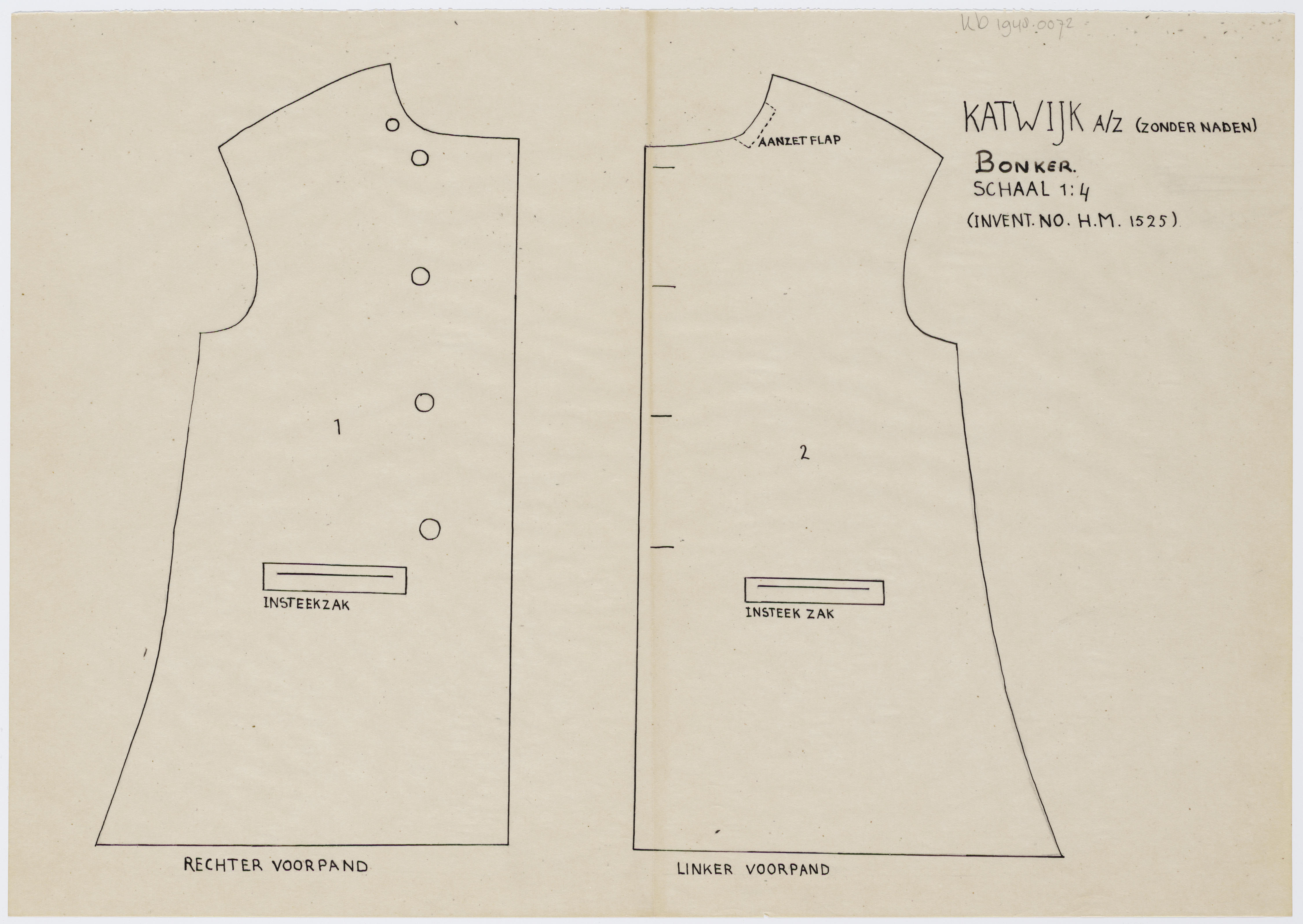 Patroontekening van een bonker, gedragen door een man. Schaal 1:4.