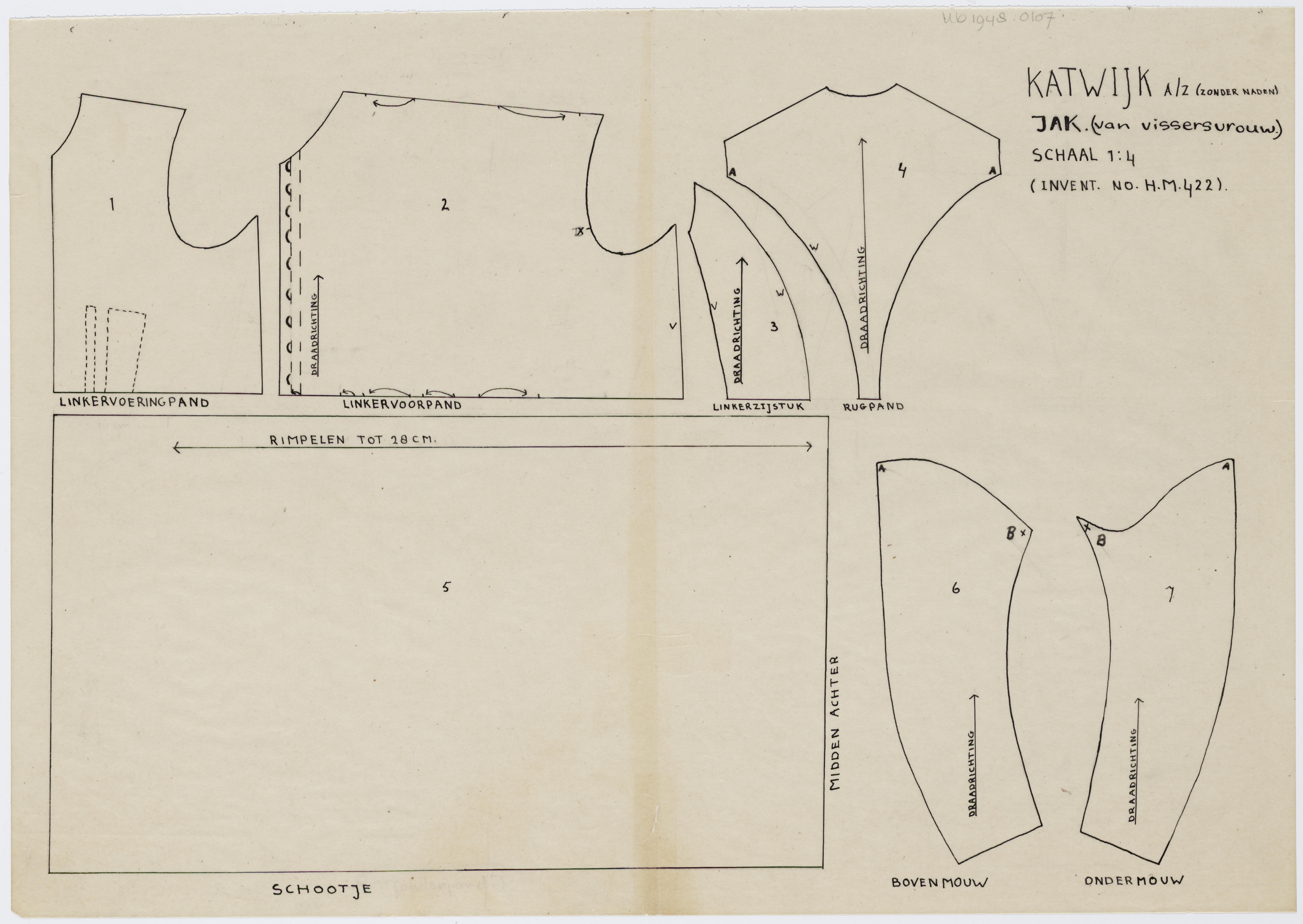 Patroontekening van een jak, gedragen door een vissersvrouw. Schaal 1:4.