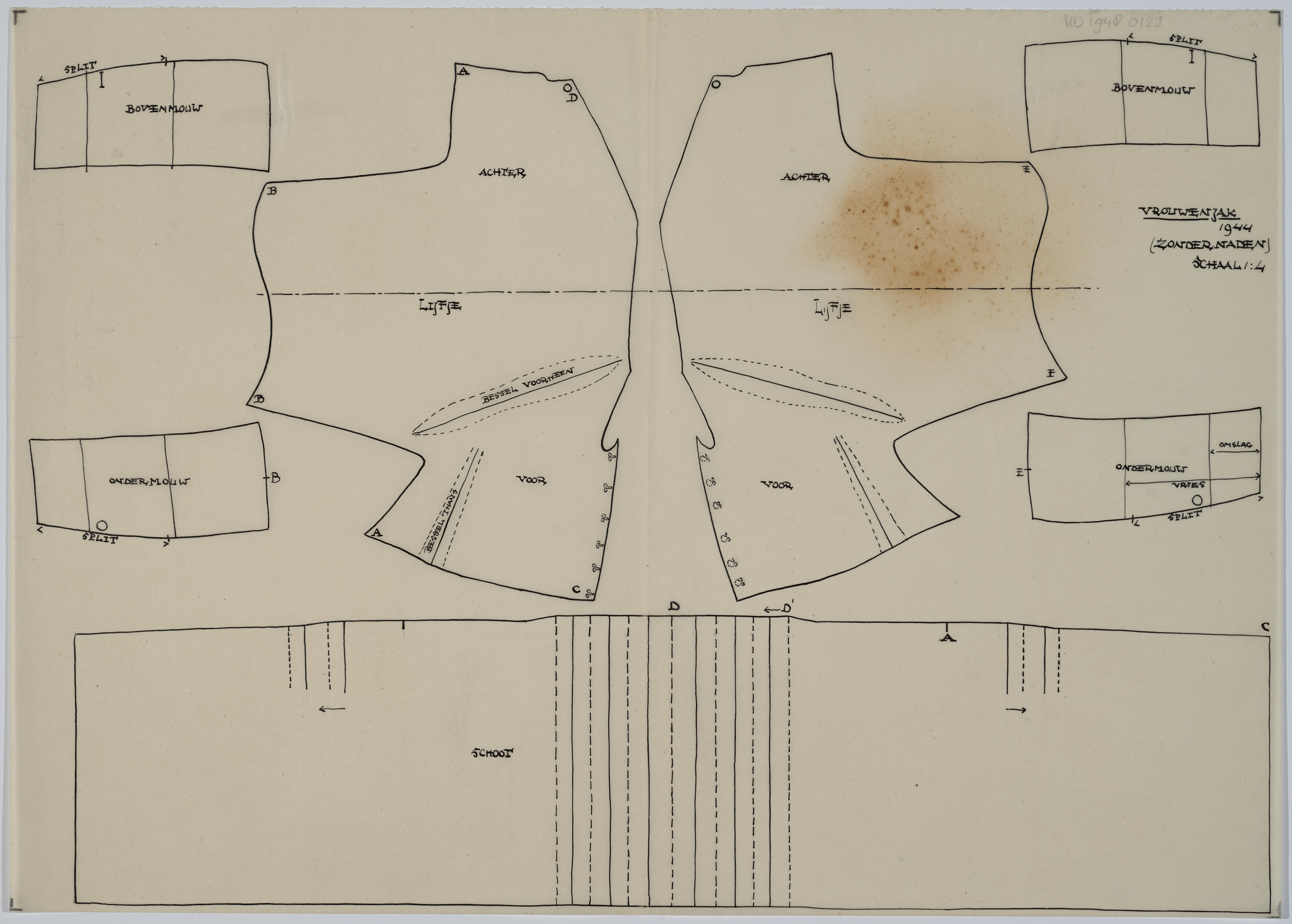 Patroontekening van een vrouwenjak uit 1944. Schaal 1:4.