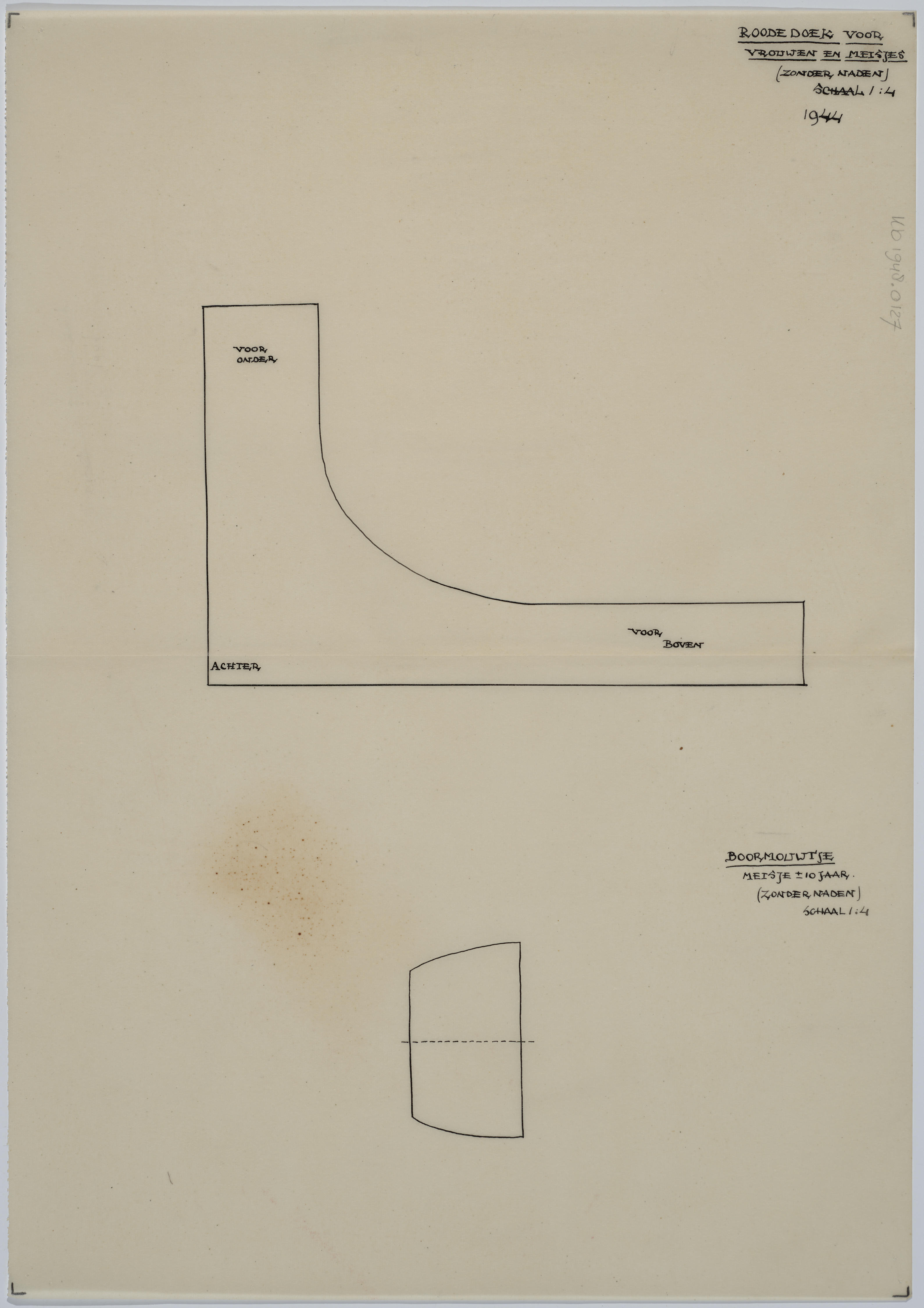 Patroontekening van een rode doek uit 1944, gedragen door vrouwen en meisjes. Schaal 1:4.
