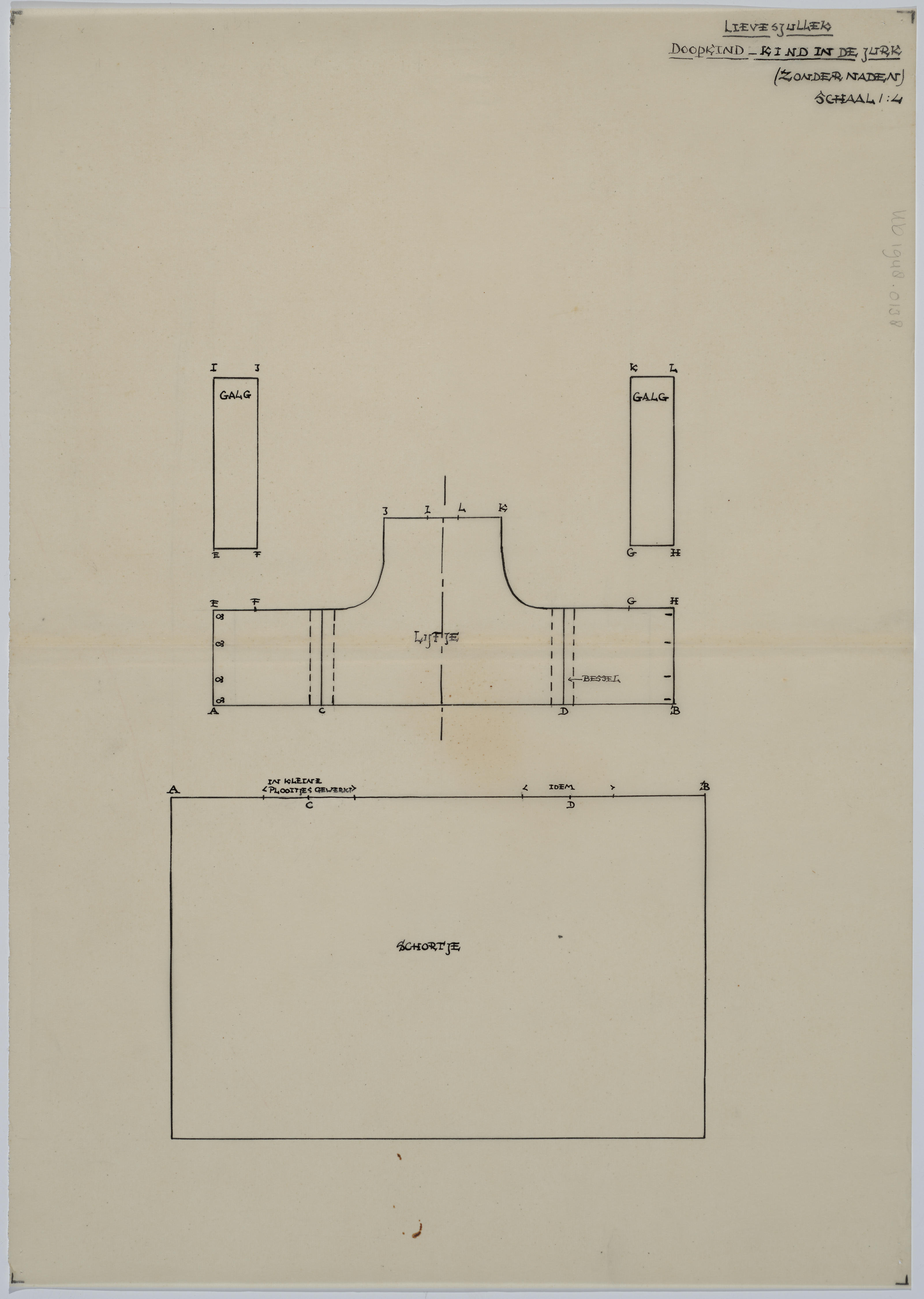 Patroontekening van een 'lievesjullek', gedragen door een doopkind en het kind in de jurk. Schaal 1:4.