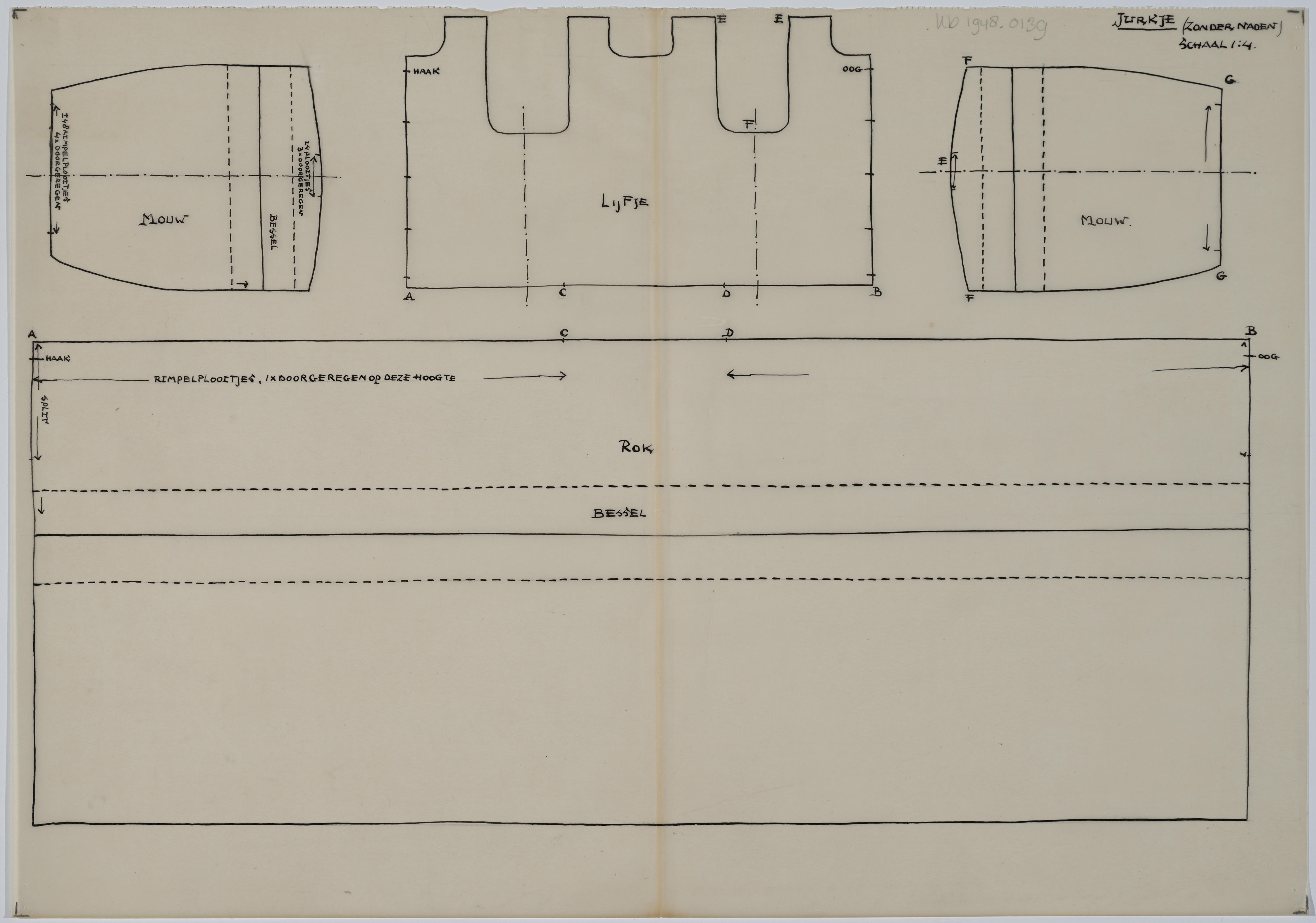 Patroontekening van een jurkje, gedragen door een kind. Schaal 1:4.