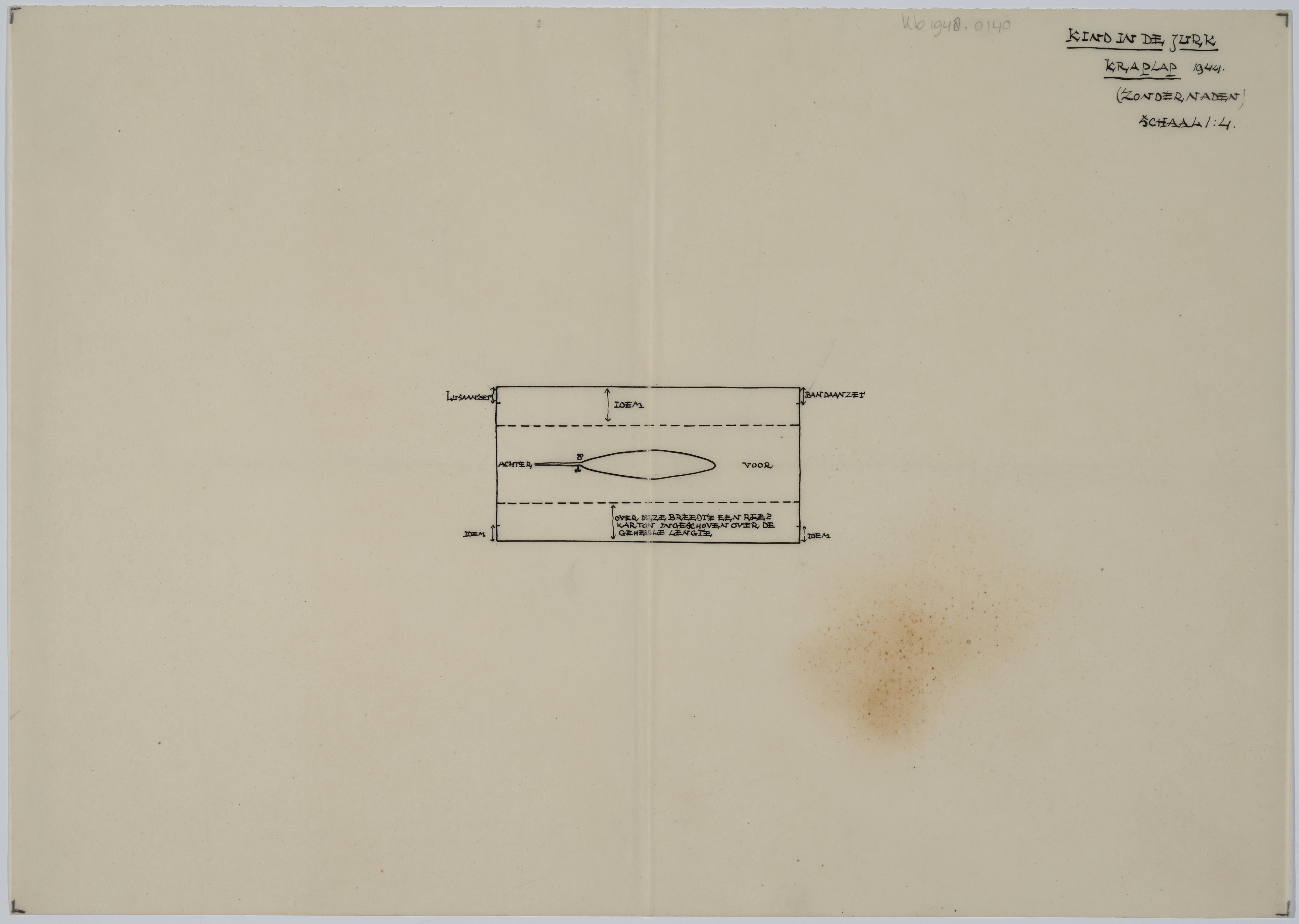 Patroontekening van een kraplap uit 1944, gedragen door het kind in de jurk. Schaal 1:4.