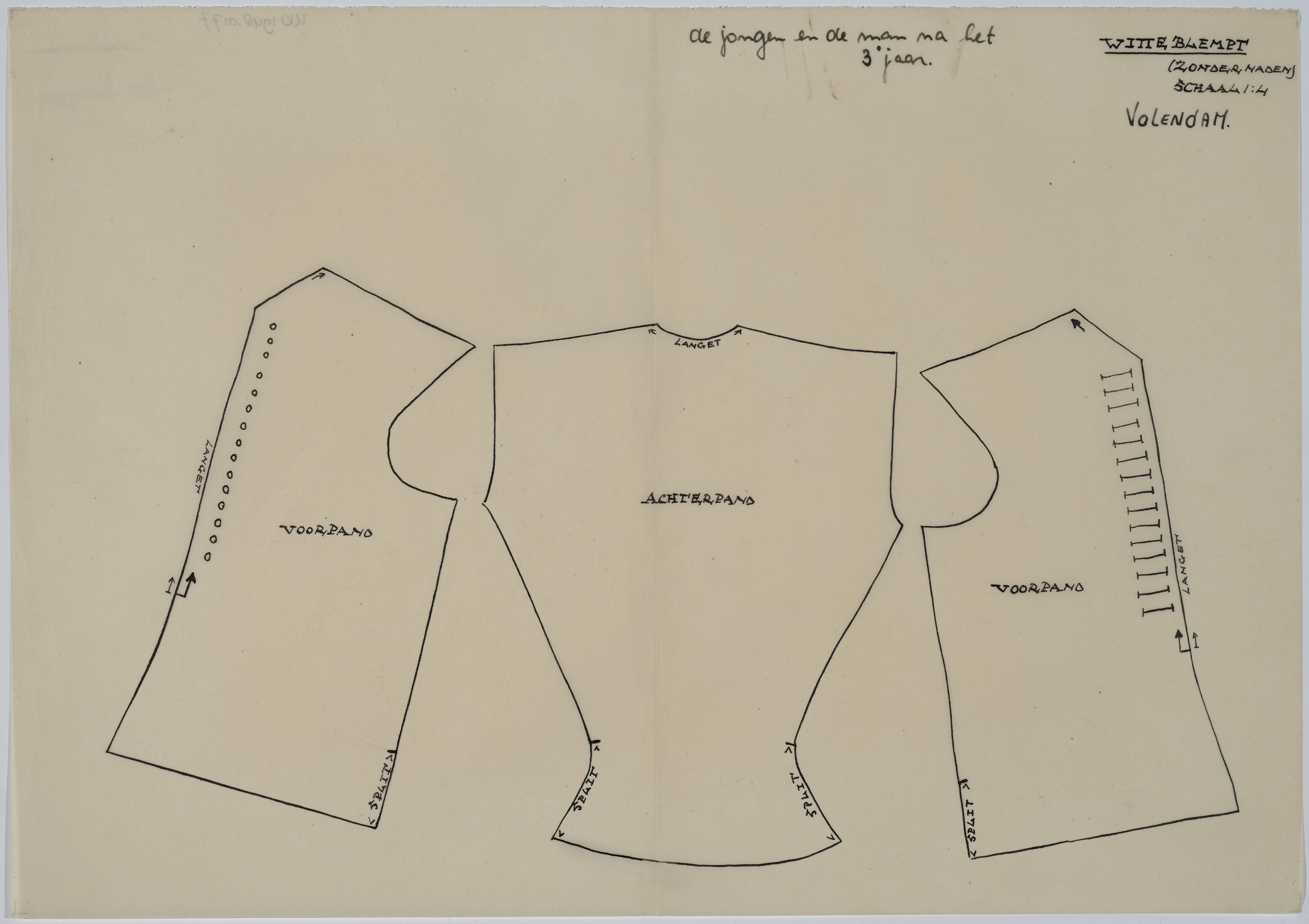 Patroontekening van een witte blempt, gedragen door een jongen. Schaal 1:4.