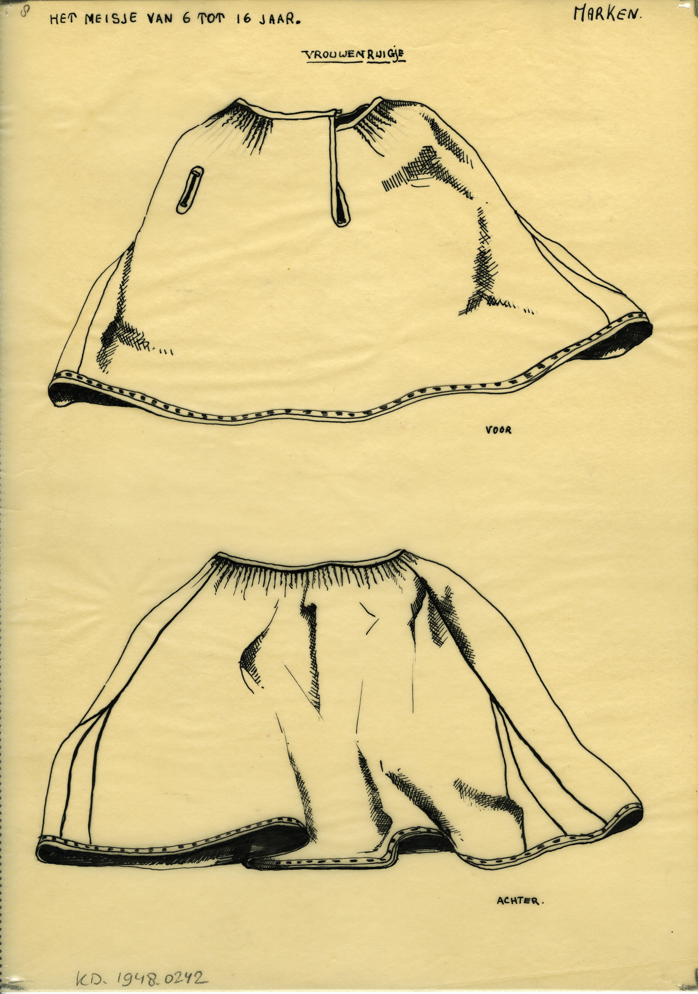 Tekening van de voor- en achterzijde van een vrouwenruigje van Marken voor meisjes van 6 tot 16 jaar.