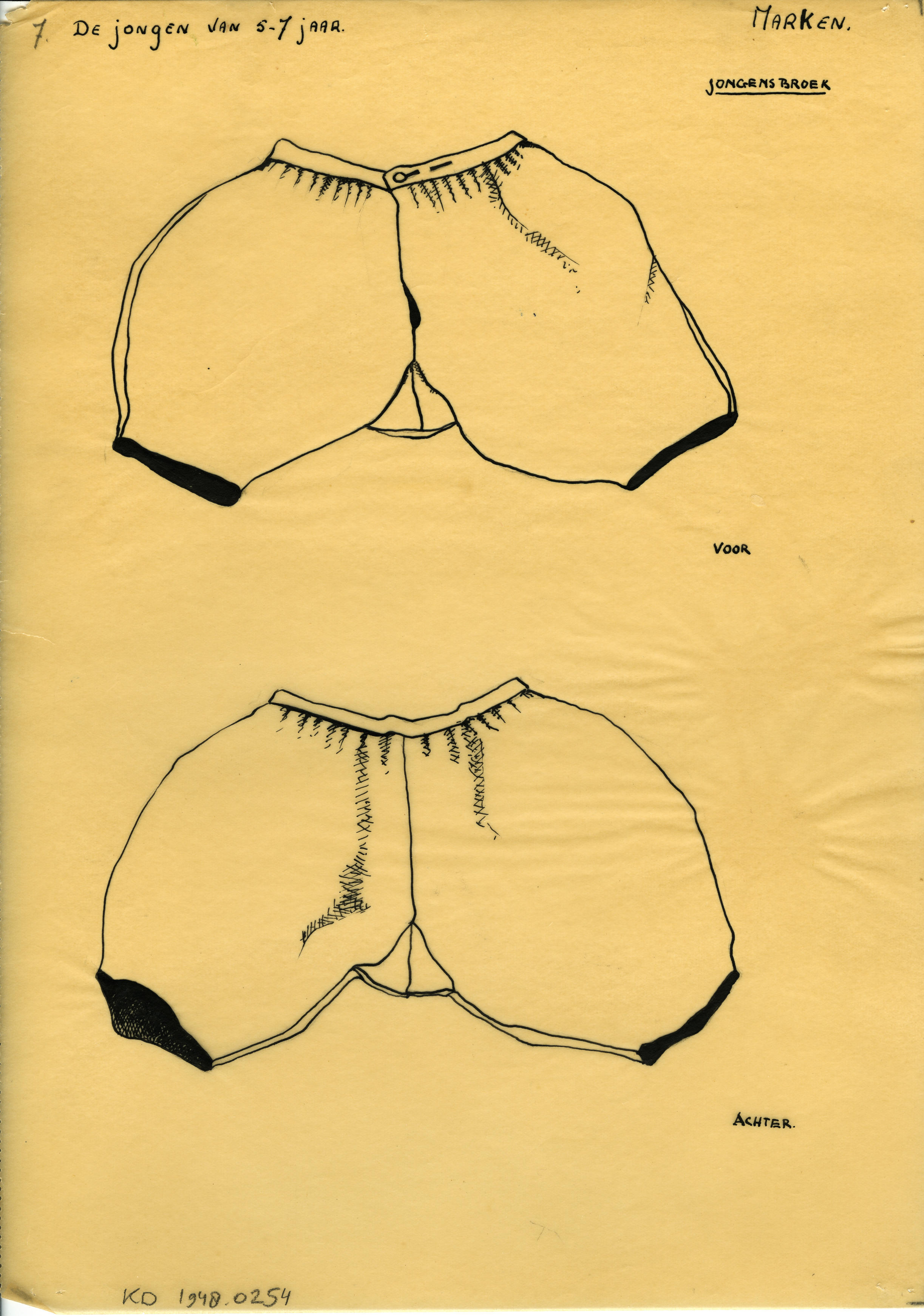 Tekening van de voor- en achterzijde van een jongensbroek van Marken voor jongens van 5 tot 7 jaar.