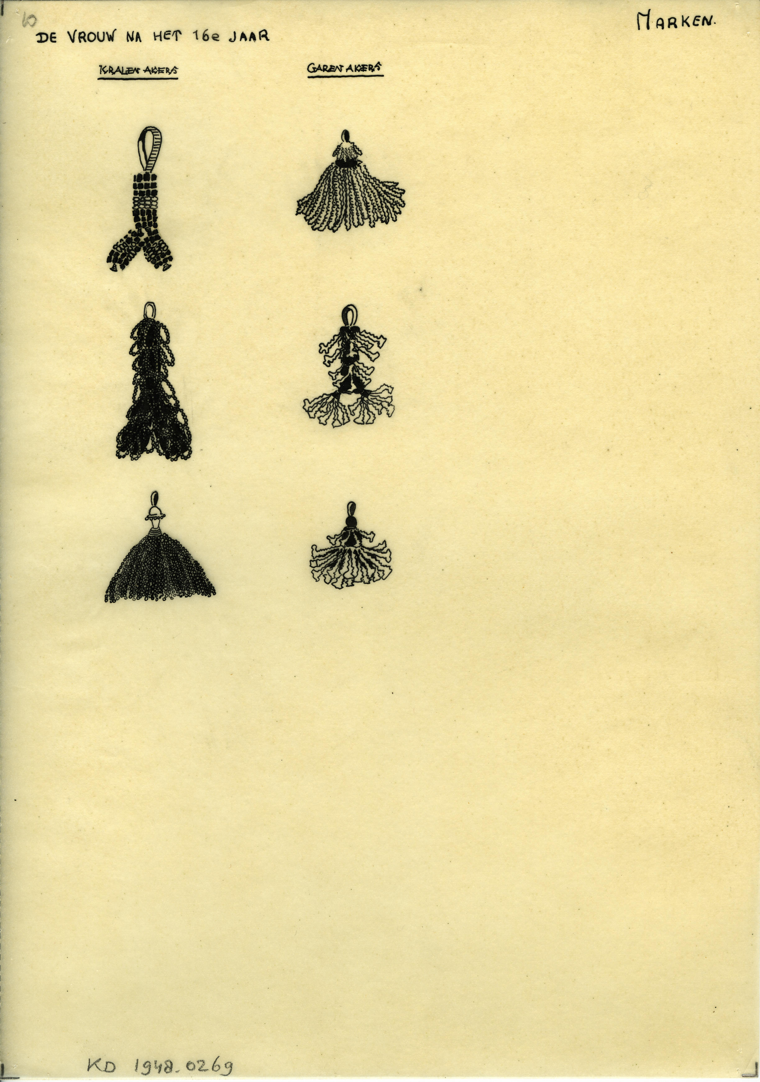 Tekening van kralen akers en garen akers voor een vrouw op Marken na het zestiende jaar.