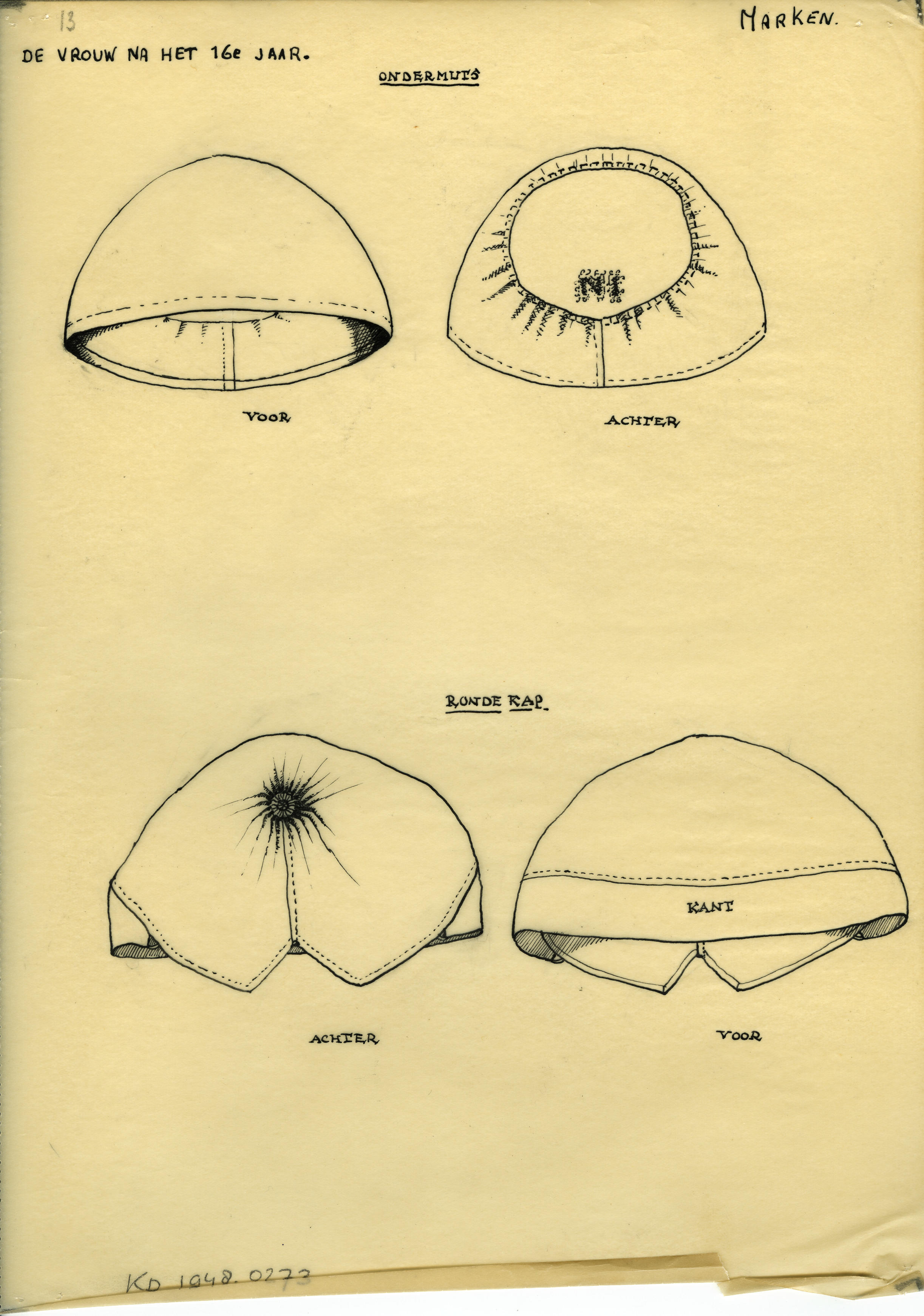 Tekening van de voor- en achterzijde van een ondermuts en een ronde kap voor een vrouw op Marken na het zestiende jaar.
