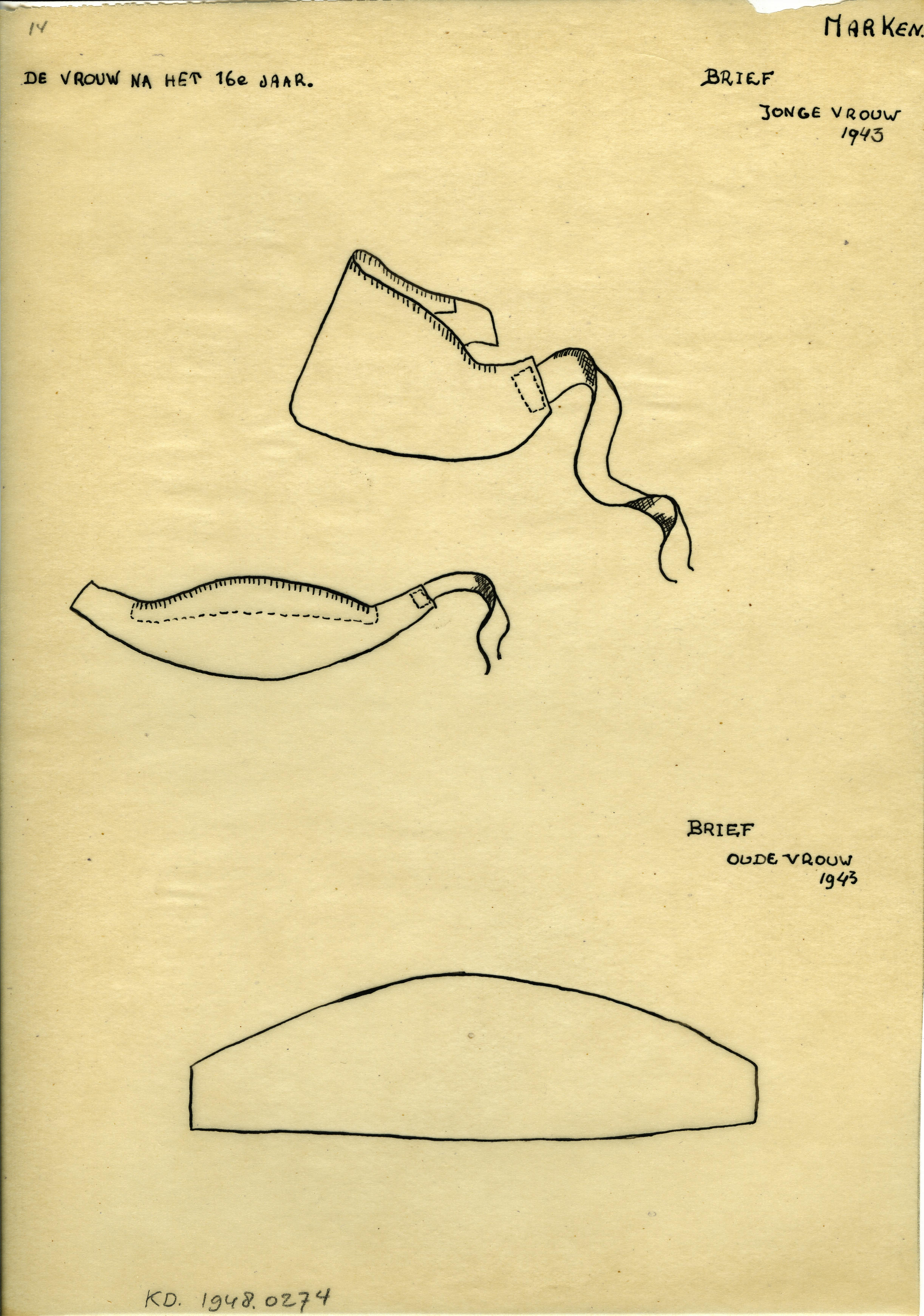 Tekening van een zogenoemde brief voor een jonge en oude vrouw, zoals deze in 1943 op Marken is gedragen.