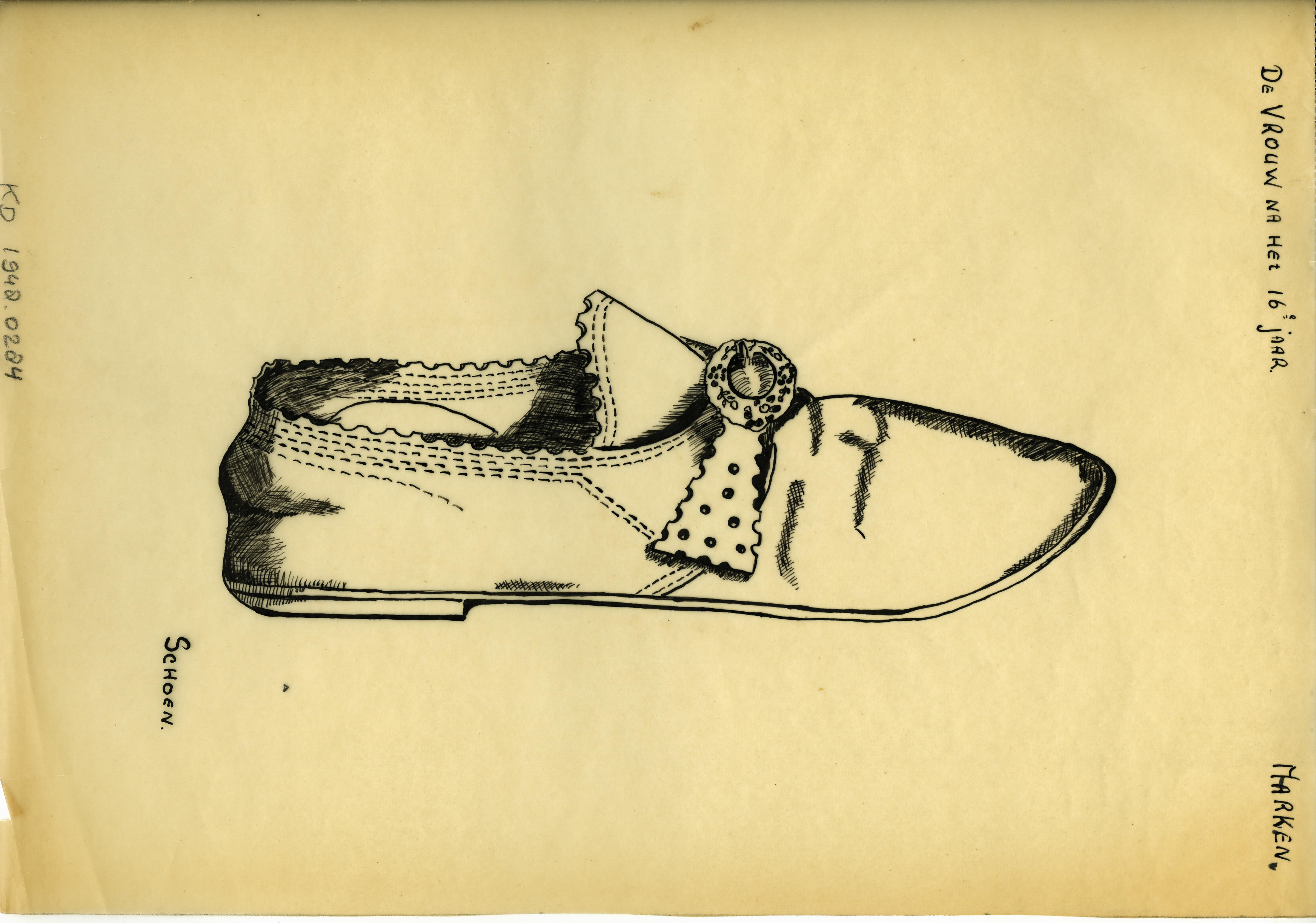 Tekening van de zijkant van een schoen voor een vrouw op Marken na het zestiende jaar.
