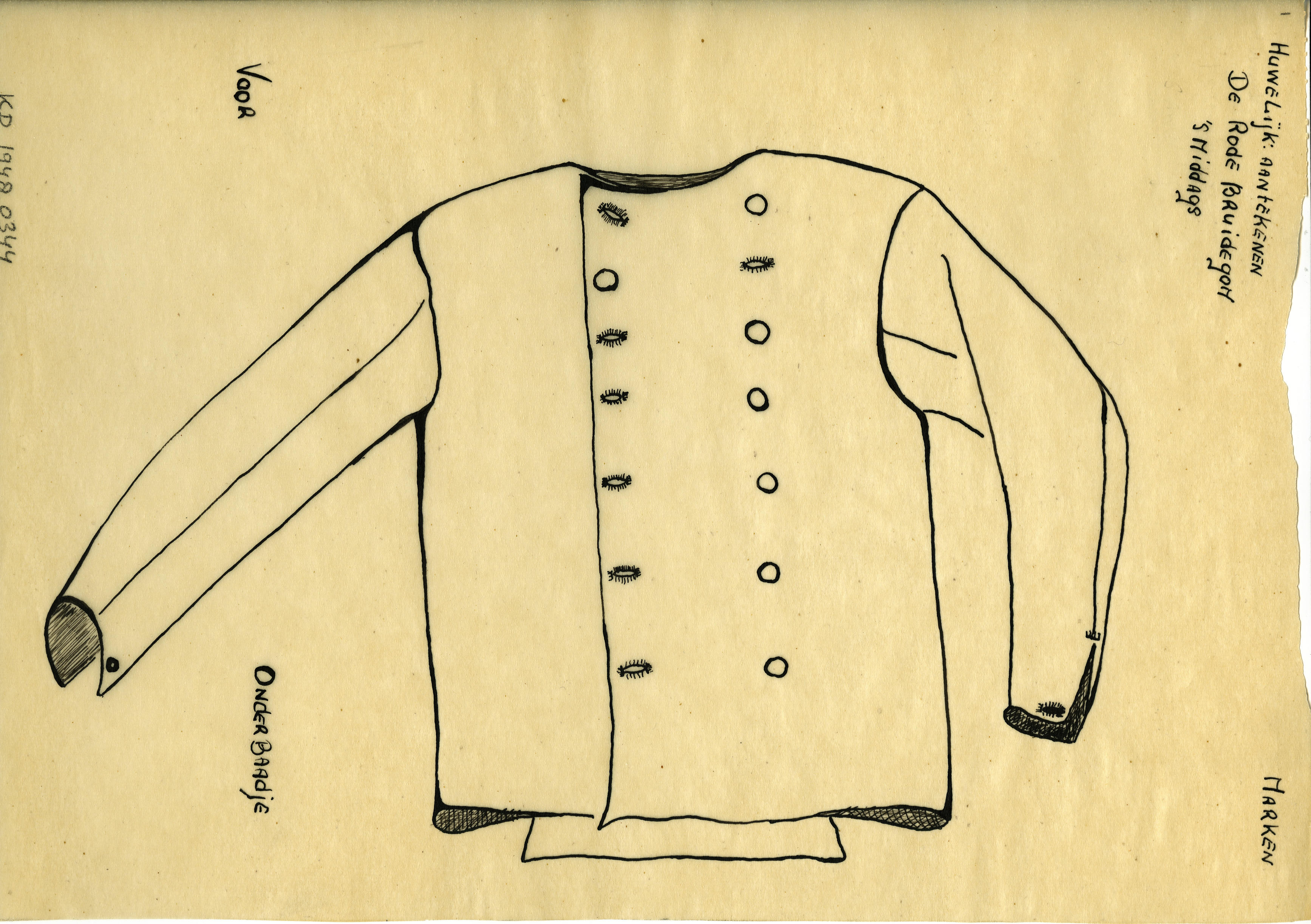 Tekening van de voorzijde van een zogenoemd onderbaadje van Marken voor het aantekenen van de bruidegom van de rode bruid.