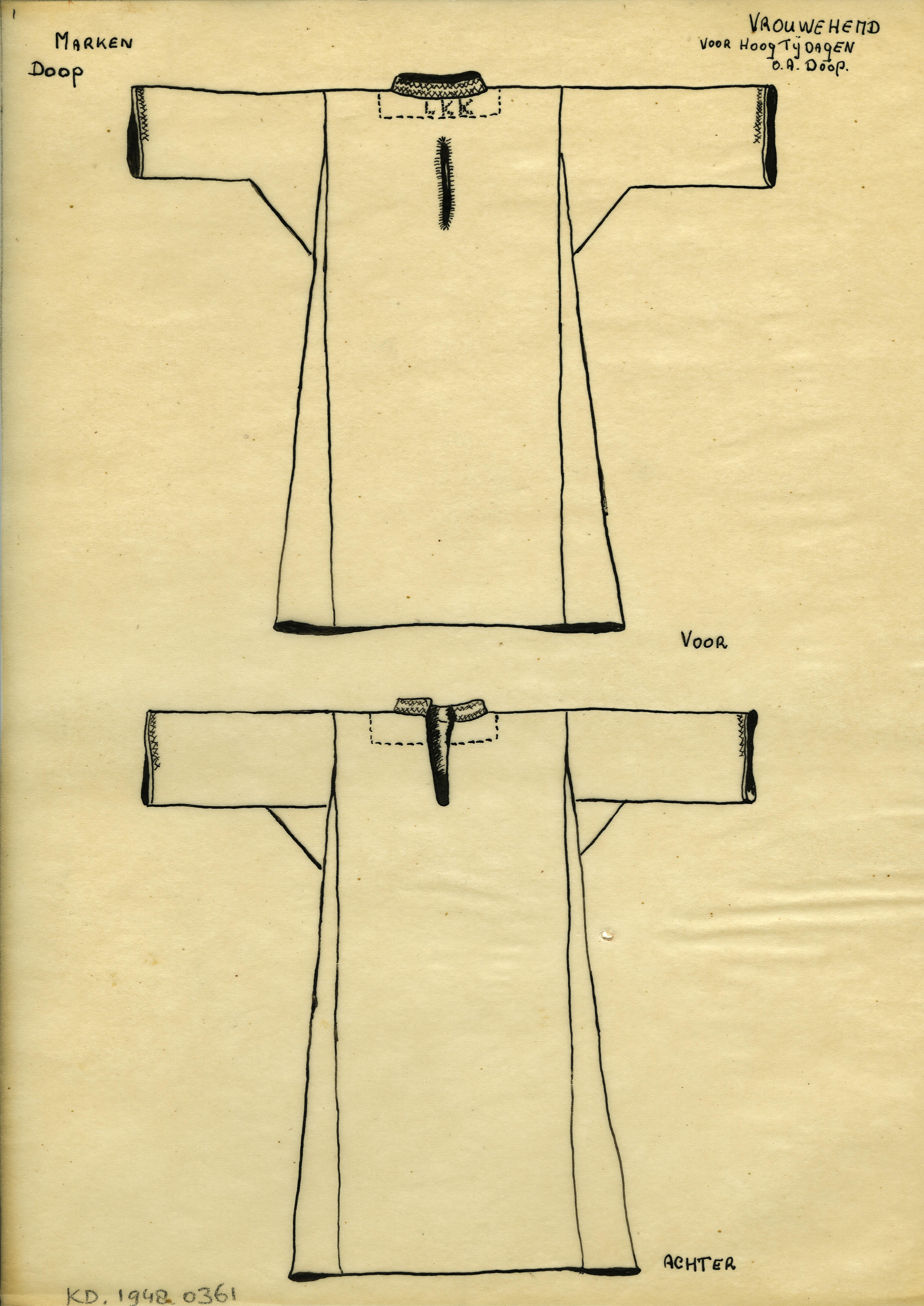 Tekening van de voor- en achterzijde van een vrouwenhemd van Marken voor hoogtijdagen, waaronder de doop.