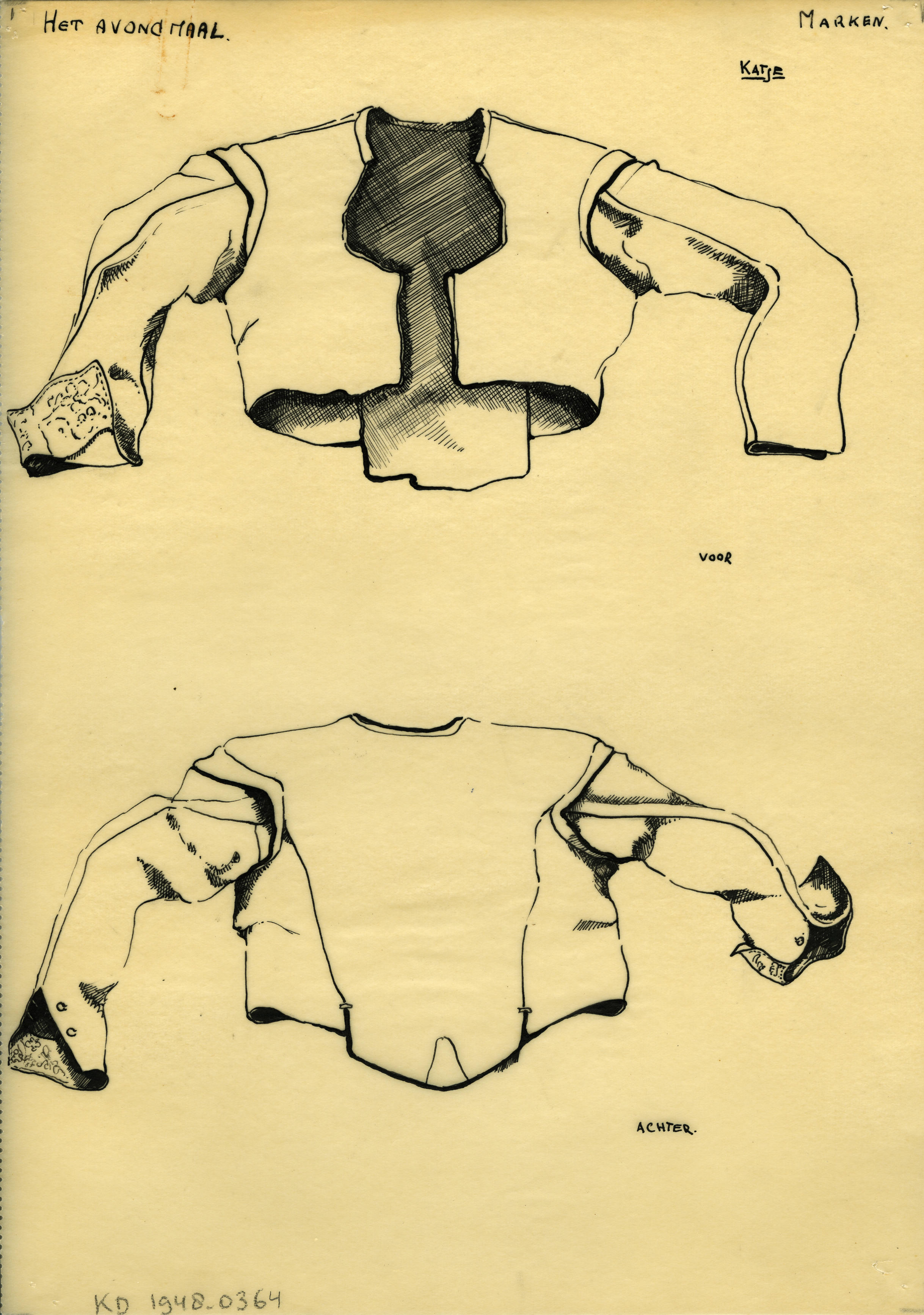 Tekening van de voor- en achterzijde van een zogenoemd katje, een vrouwenjak van zwarte of donkerblauwe wollen stof. Een katje werd door Marker vrouwen gedragen als ze deelnamen aan het Heilig Avondmaal. Tijdens het dragen sloeg men de mouwen aan de voorzijde terug. Hierdoor werd de strook damasten stof die tegen de voering is genaaid ...