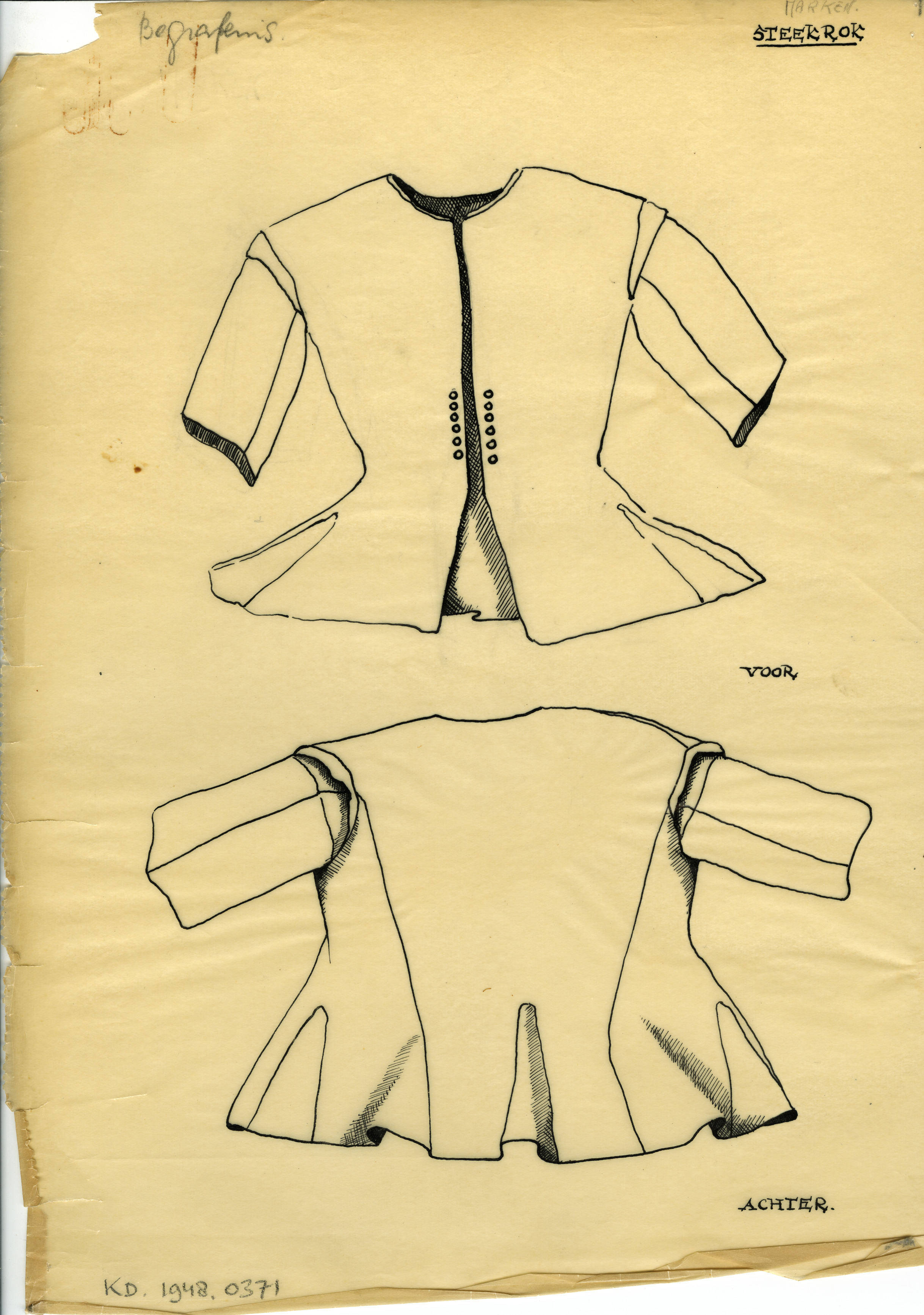 Tekening van de voor- en achterzijde van een zogenoemde steekrok van Marken voor een begrafenis.