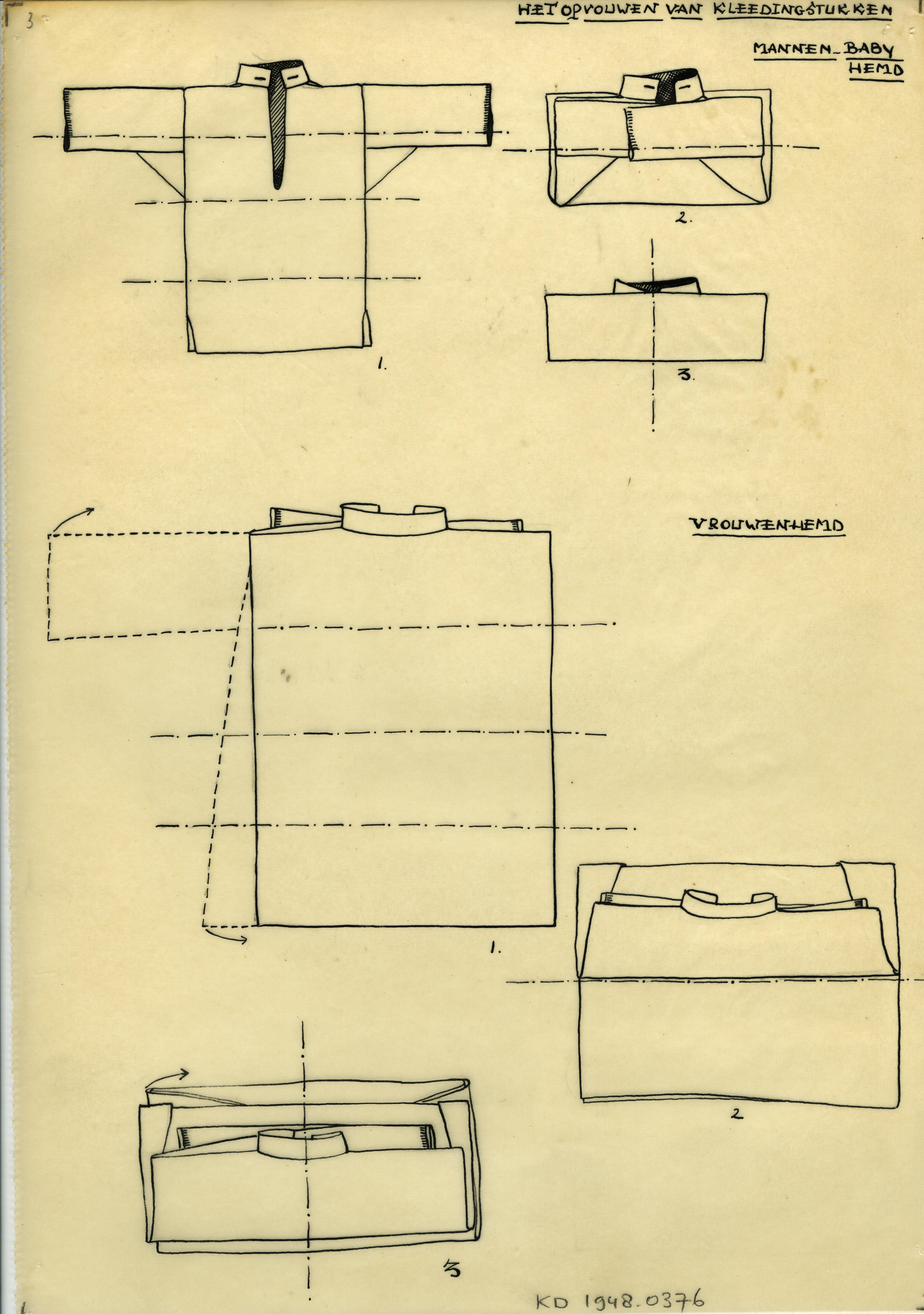 Tekening van het opvouwen van Marker kledingstukken: het mannen- en babyhemd en het vrouwenhemd.