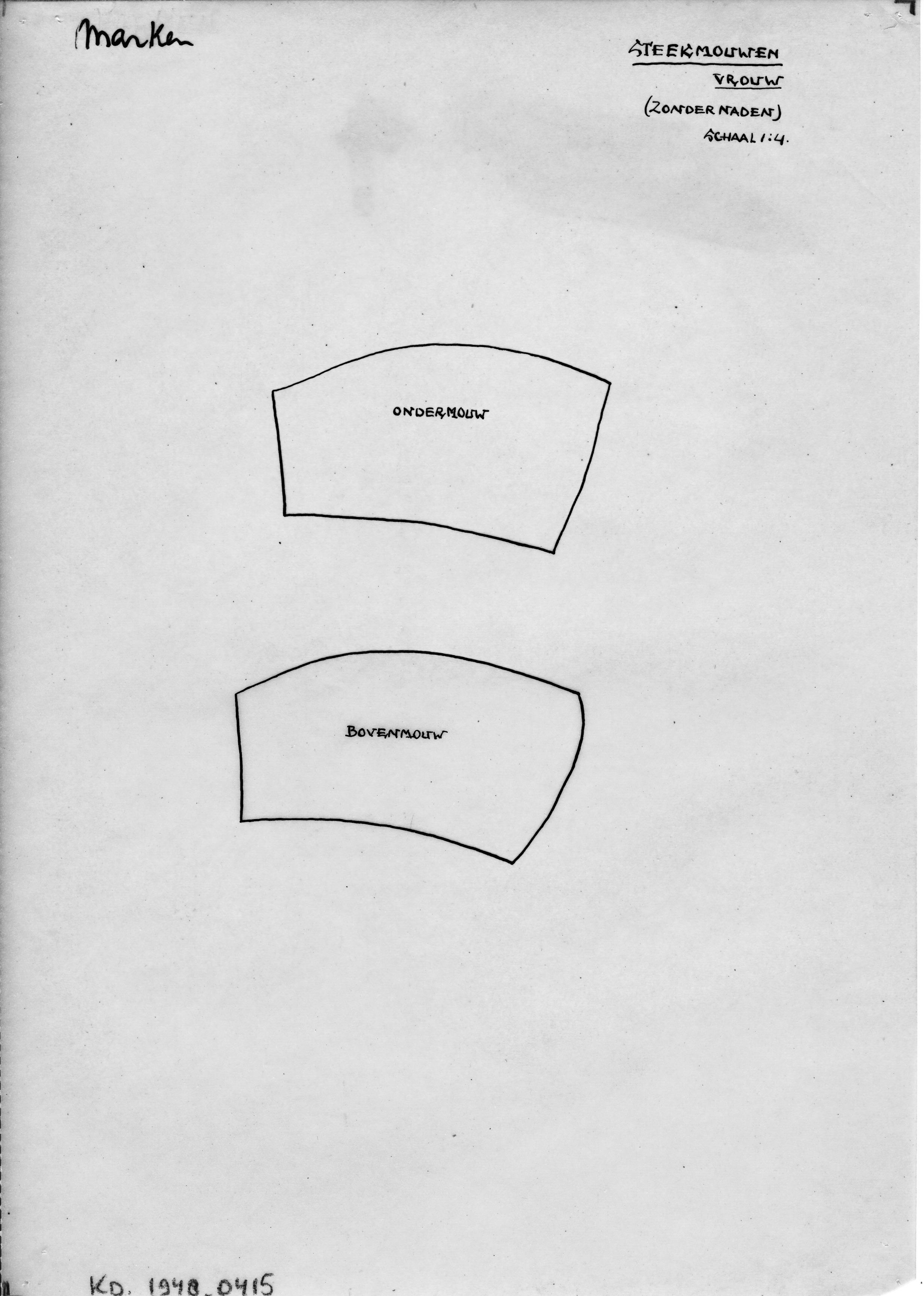 Patroontekening van een zogenoemde 'steekmouw'. Een steekmouw bestaat uit twee patroondelen. Steekmouwen worden gedragen door vrouwen op Marken. De patroondelen zijn getekend zonder naden. Schaal 1:4.
