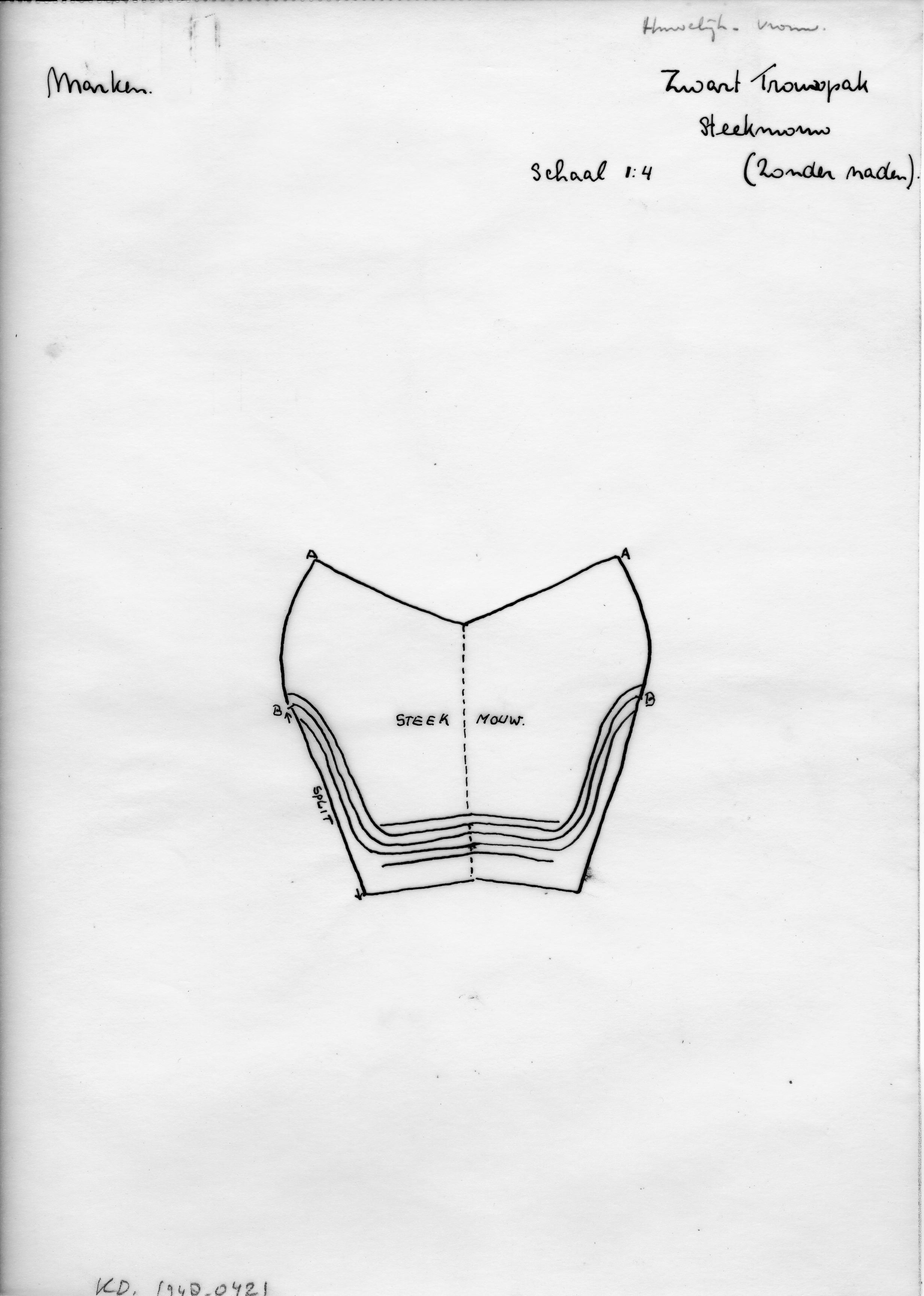 Patroontekening van een zwarte steekmouw. De zwarte steekmouwen worden door Marker bruiden gedragen bij het huwelijk. Het patroondeel is getekend zonder naden. Schaal 1:4.