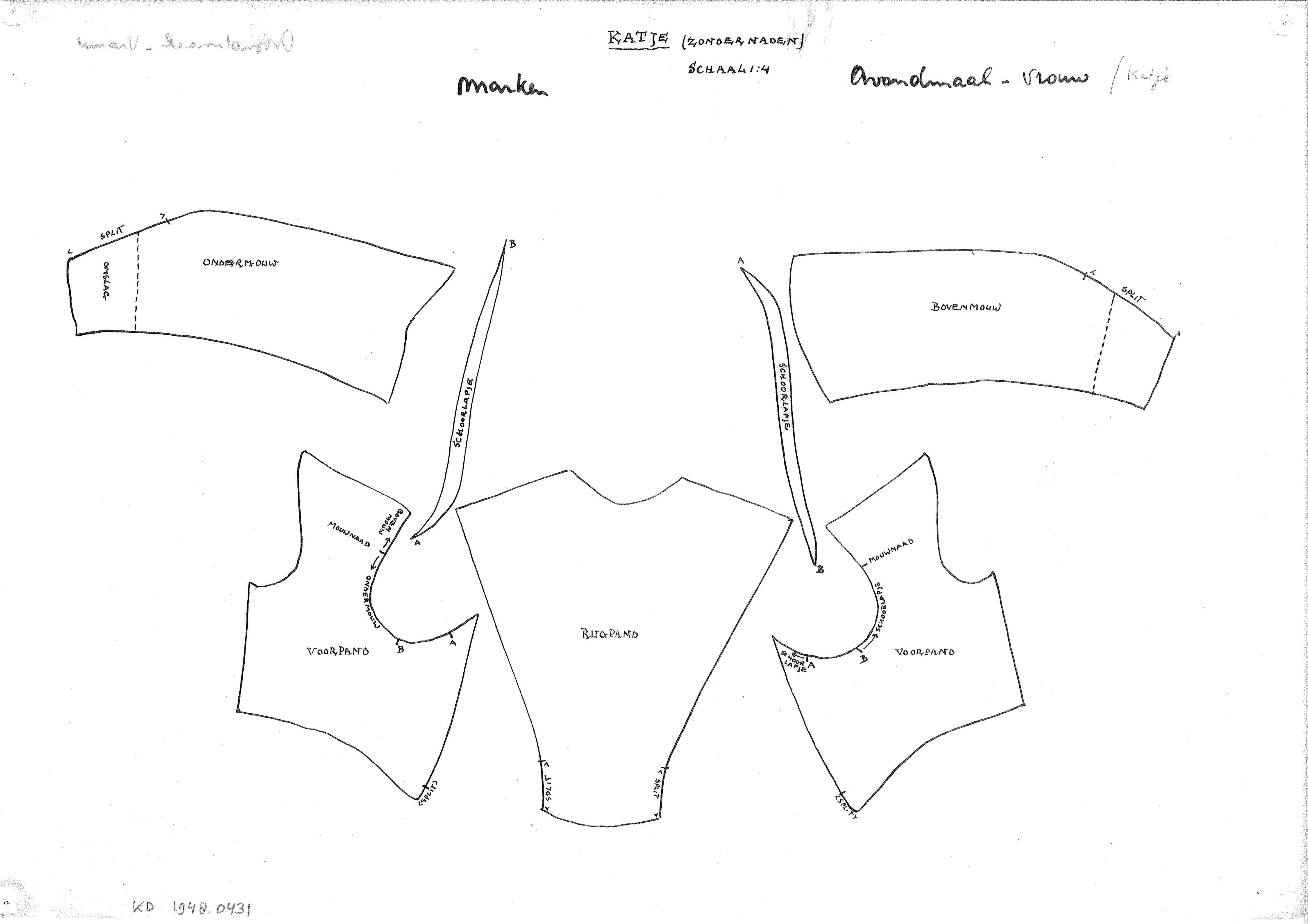 Patroontekening van een zogenoemd katje, een vrouwenjak dat door Marker vrouwen gedragen wordt bij het Heilig Avondmaal. De patroondelen zijn getekend zonder naden. Schaal 1:4.