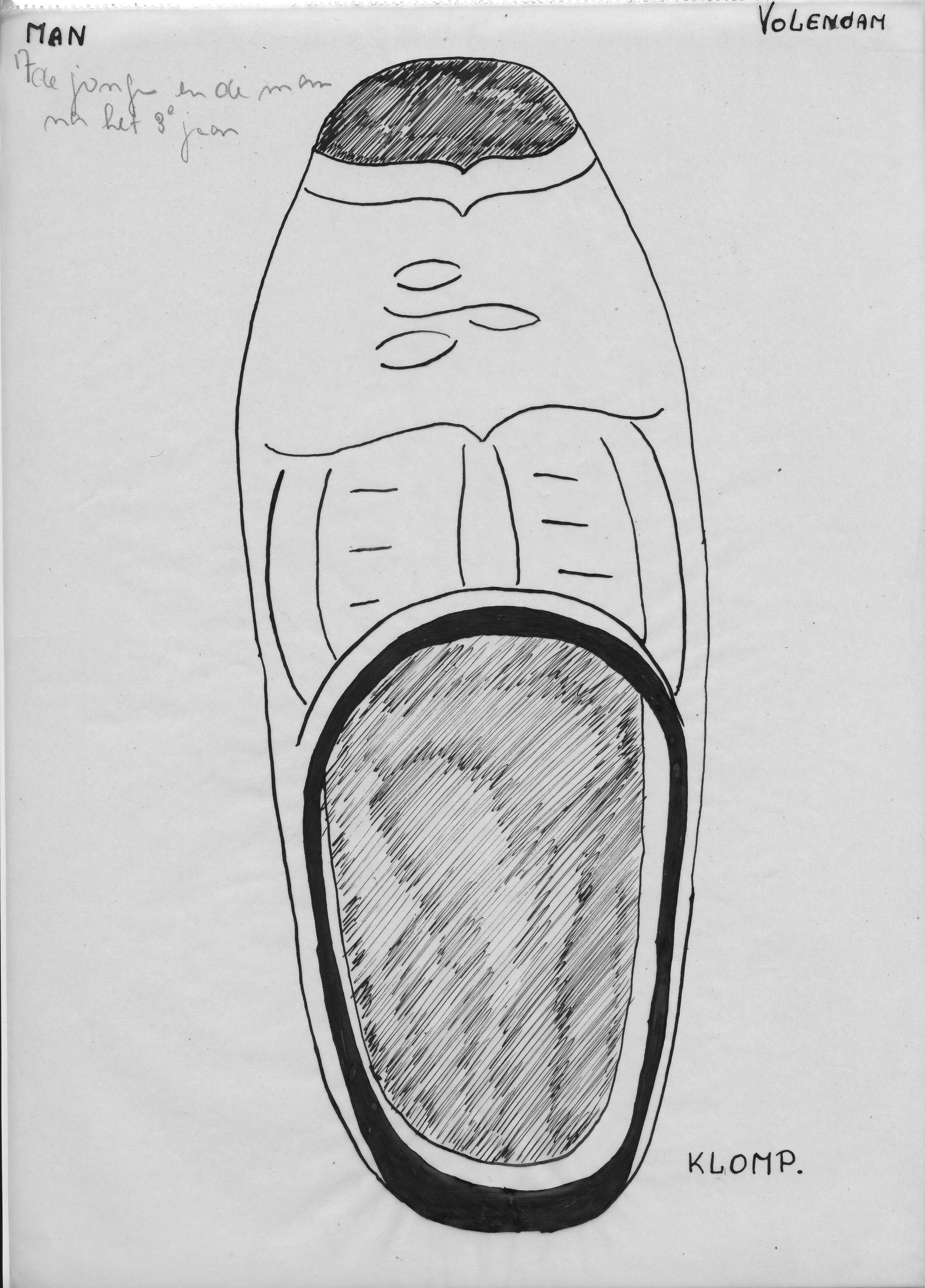 Tekening van het bovenaanzicht van een klomp uit Volendam voor mannen en jongens na het derde jaar.