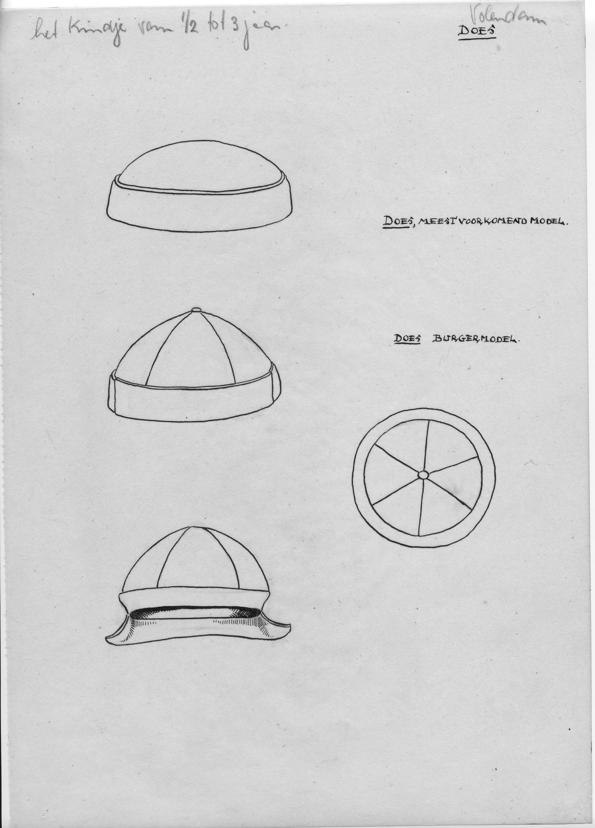 Tekening van het meest voorkomende model en het burgermodel van een zogenoemde does uit Volendam voor kinderen van een half tot drie jaar oud.