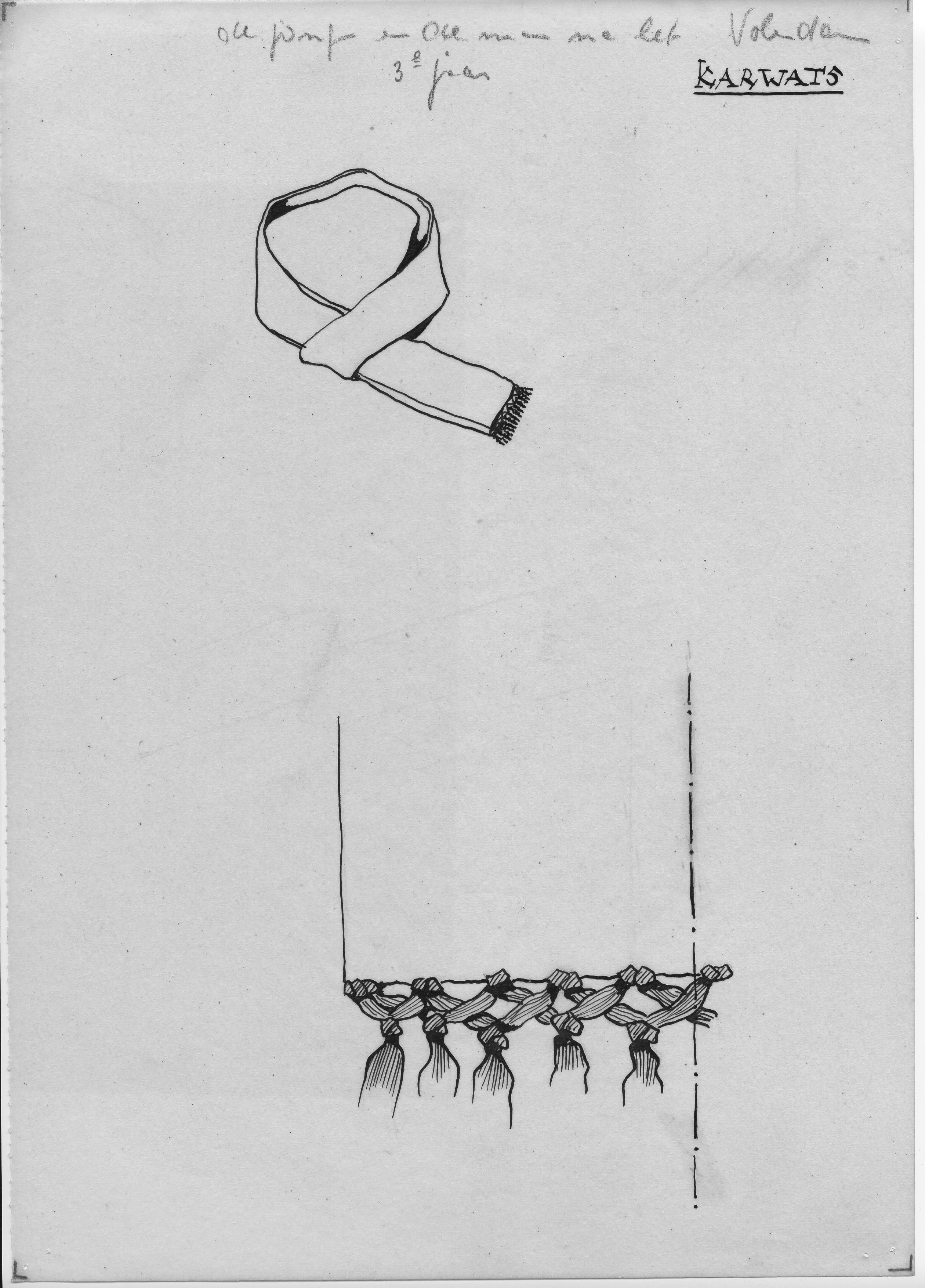 Tekening van een zogenoemde karwats en een detail van deze karwats uit Volendam voor mannen en jongens na het derde jaar.