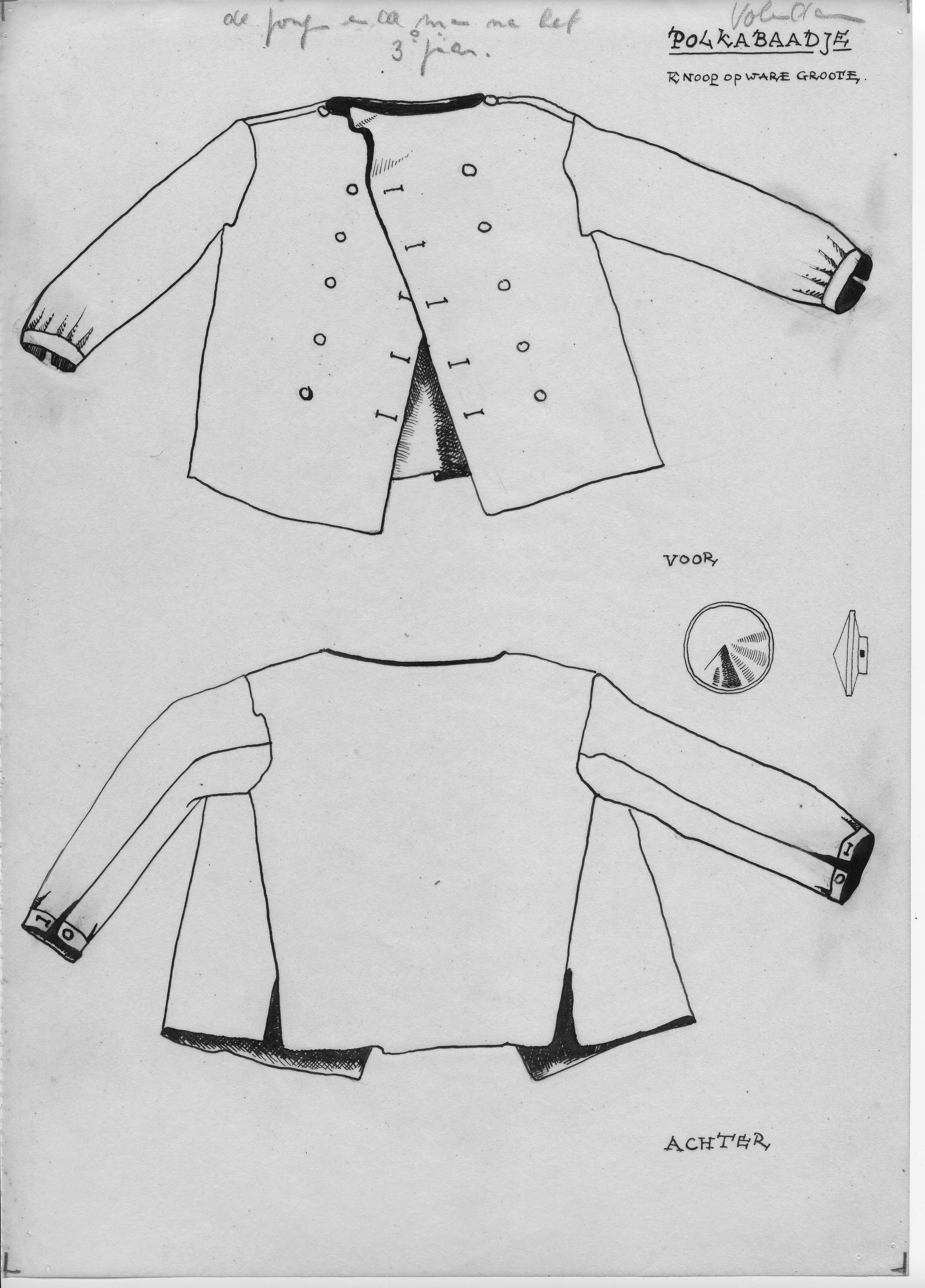 Tekening van een 'polkabaadje' en knoop, Volendam (opmetingstekening)