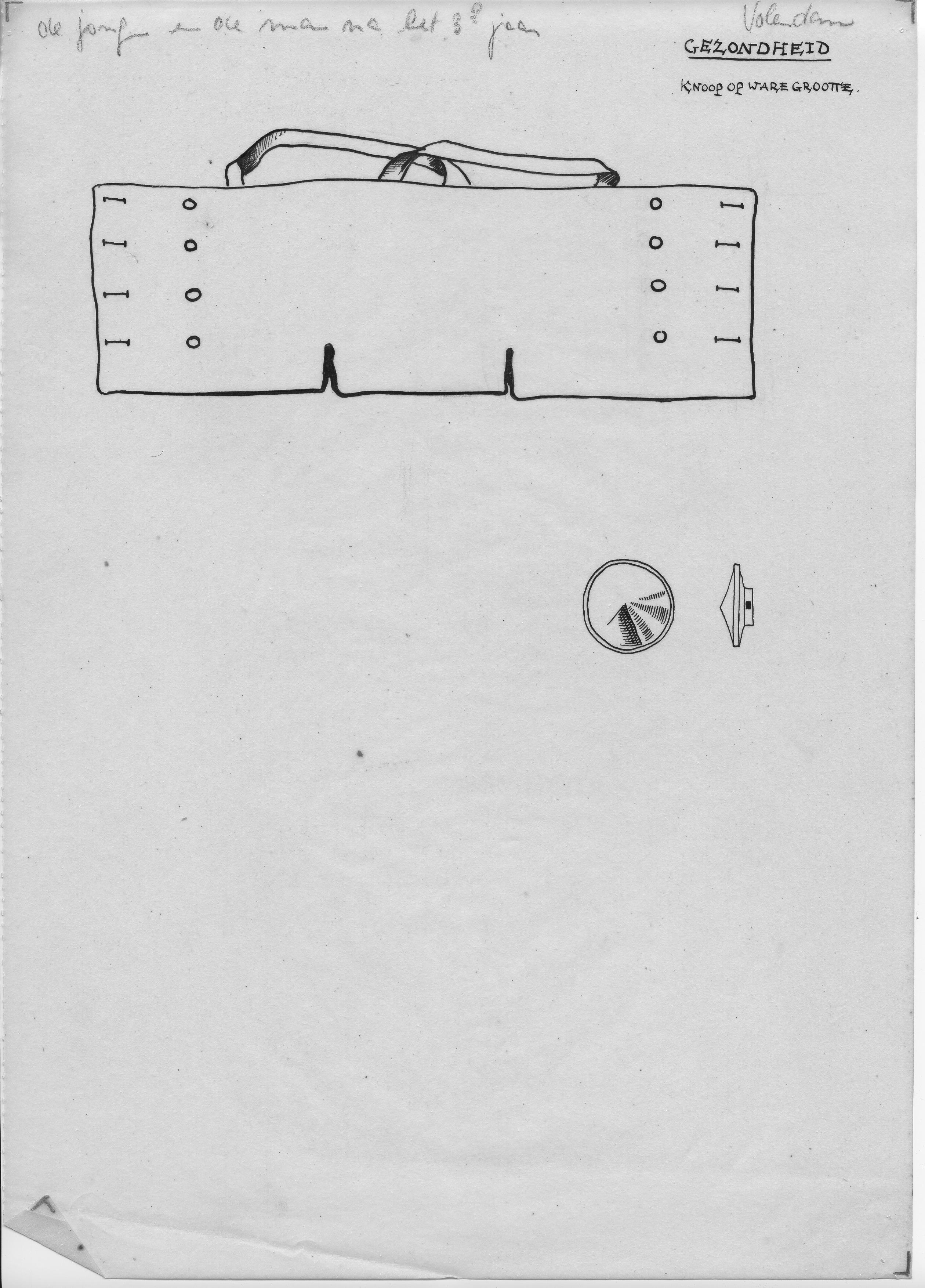 Tekening van een zogenoemde gezondheid en een knoop op ware grootte uit Volendam voor mannen en jongens na het derde jaar.