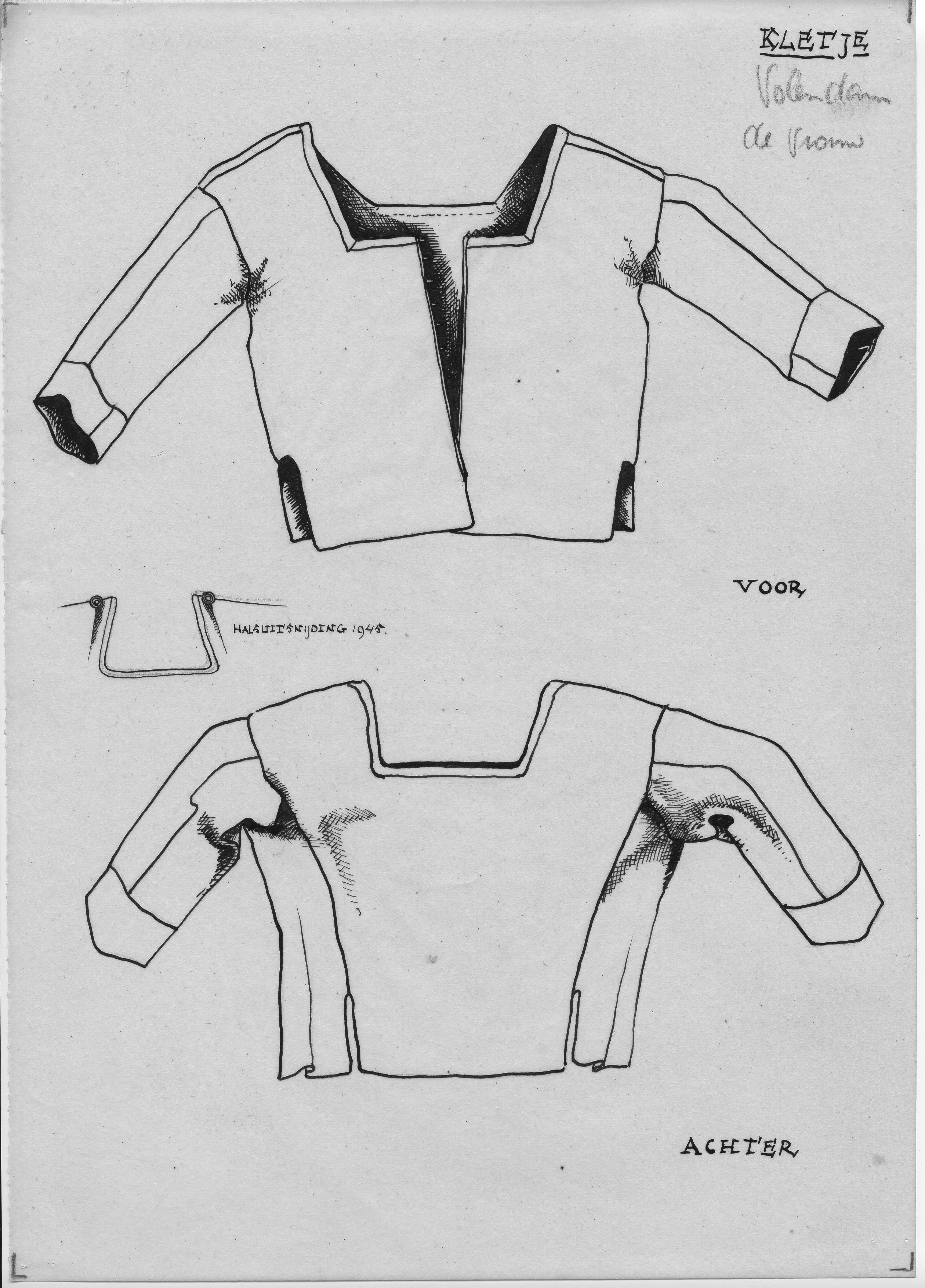 Tekening van de voor- en achterzijde van een zogenoemd vrouwenkletje uit Volendam met de halsuitsnijding zoals deze in 1945 werd gedragen.