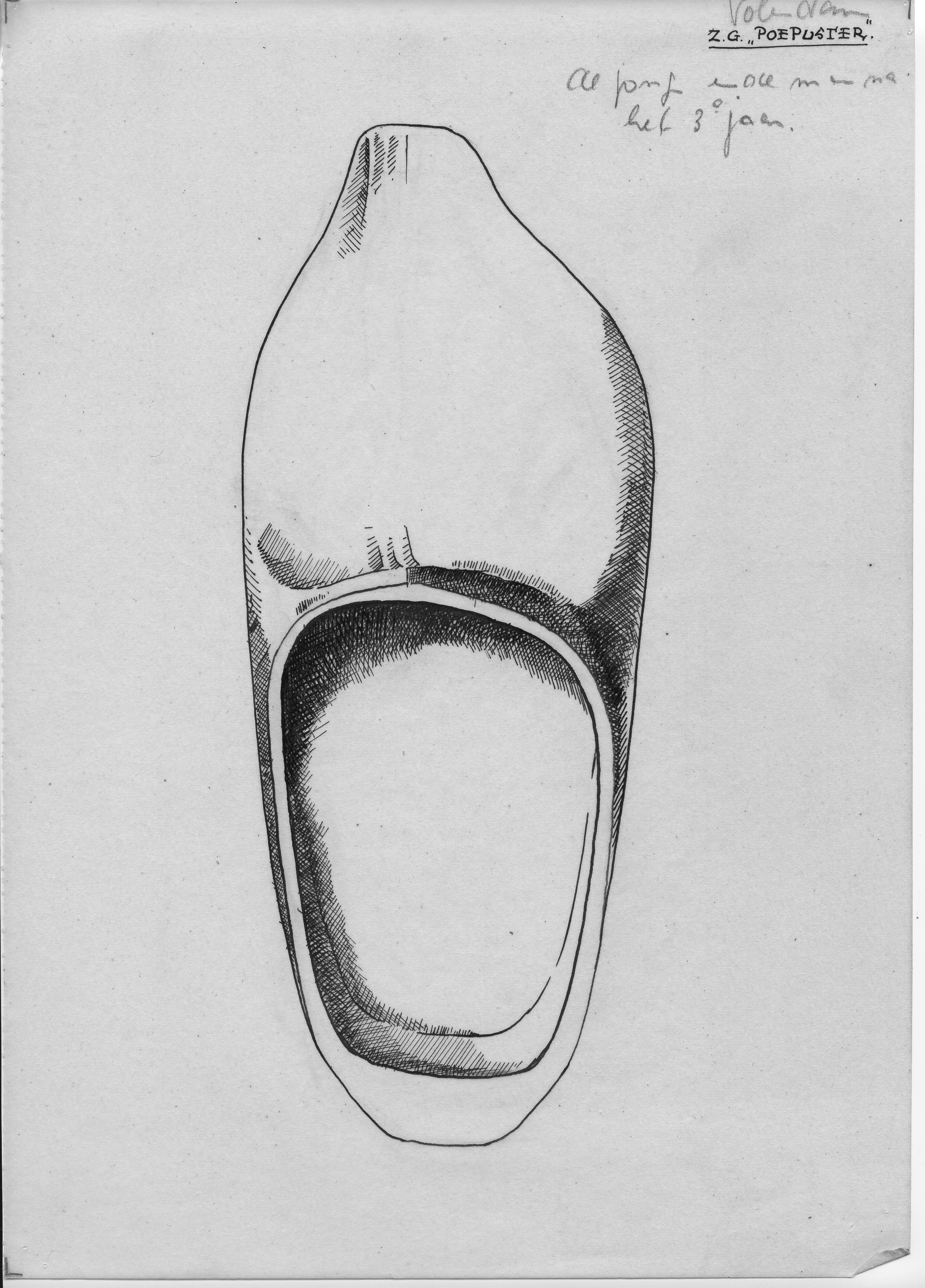 Tekening van het bovenaanzicht van een zogenoemde poepuster uit Volendam voor mannen en jongens na het derde jaar.