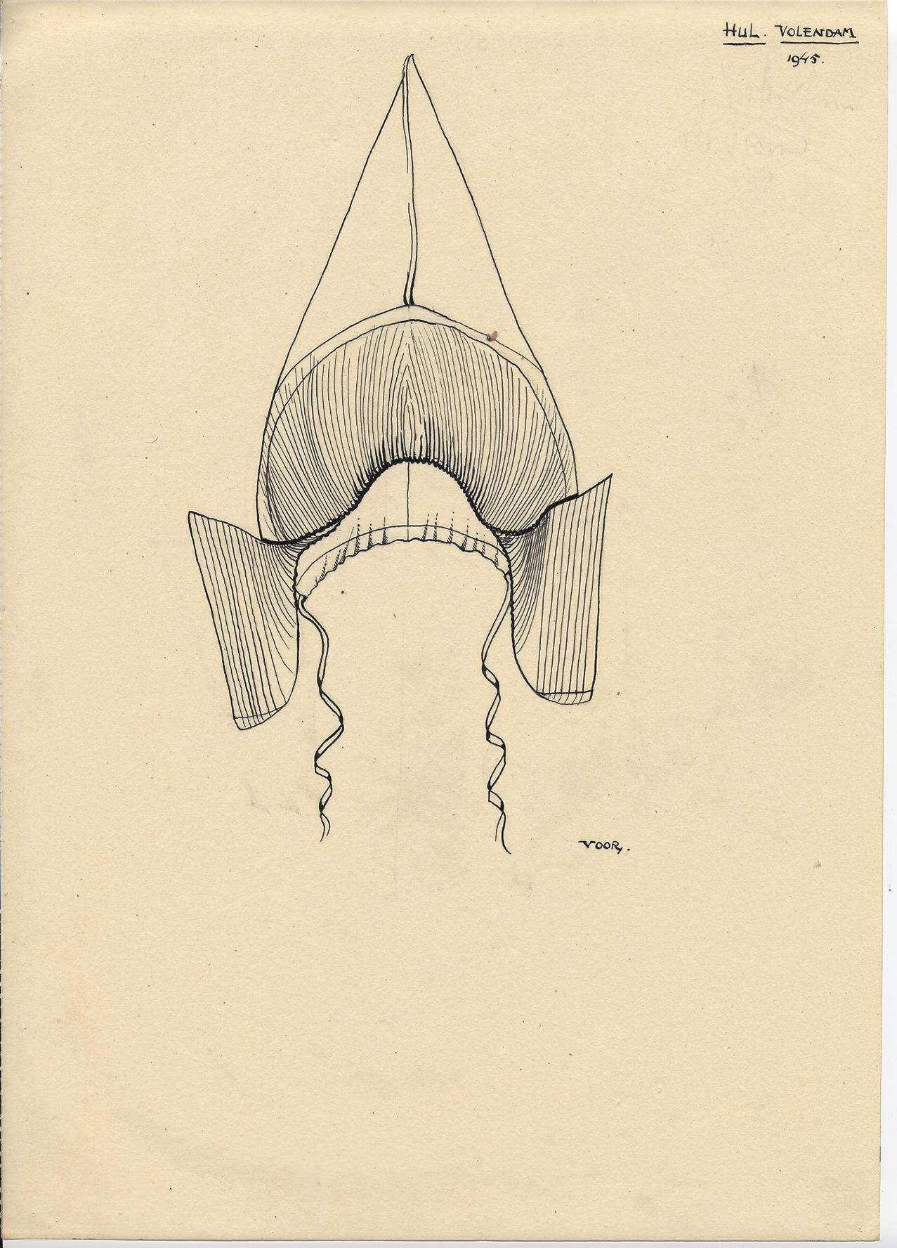Tekening van het vooraanzicht van een hul uit Volendam zoals deze in 1945 werd gedragen.