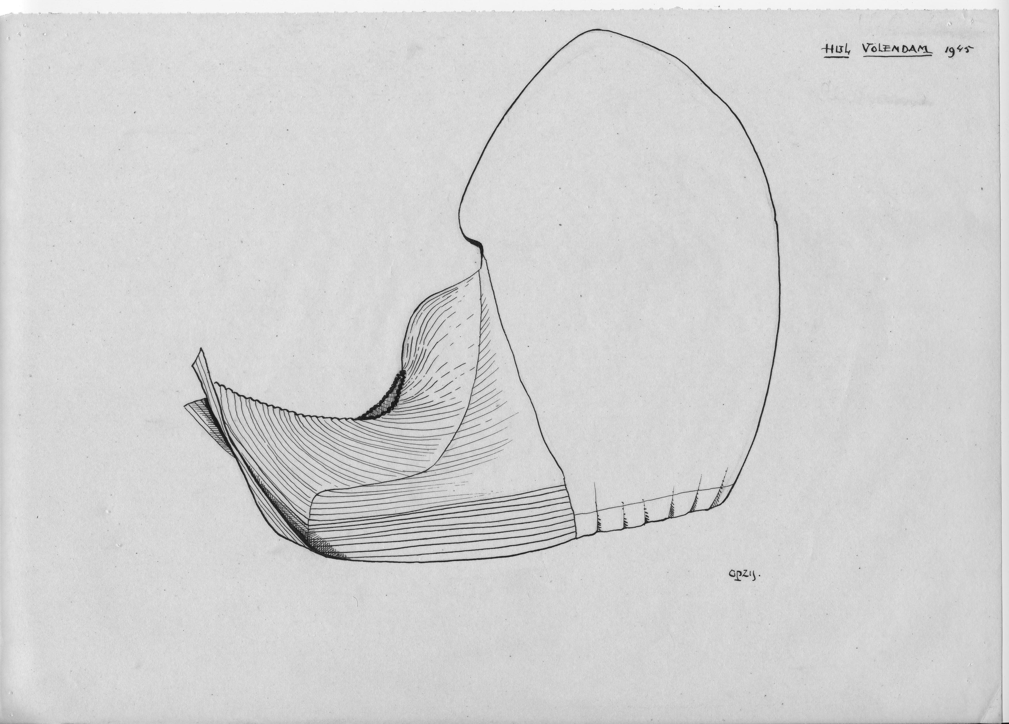 Tekening van het zijaanzicht van een hul uit Volendam zoals deze in 1945 werd gedragen.
