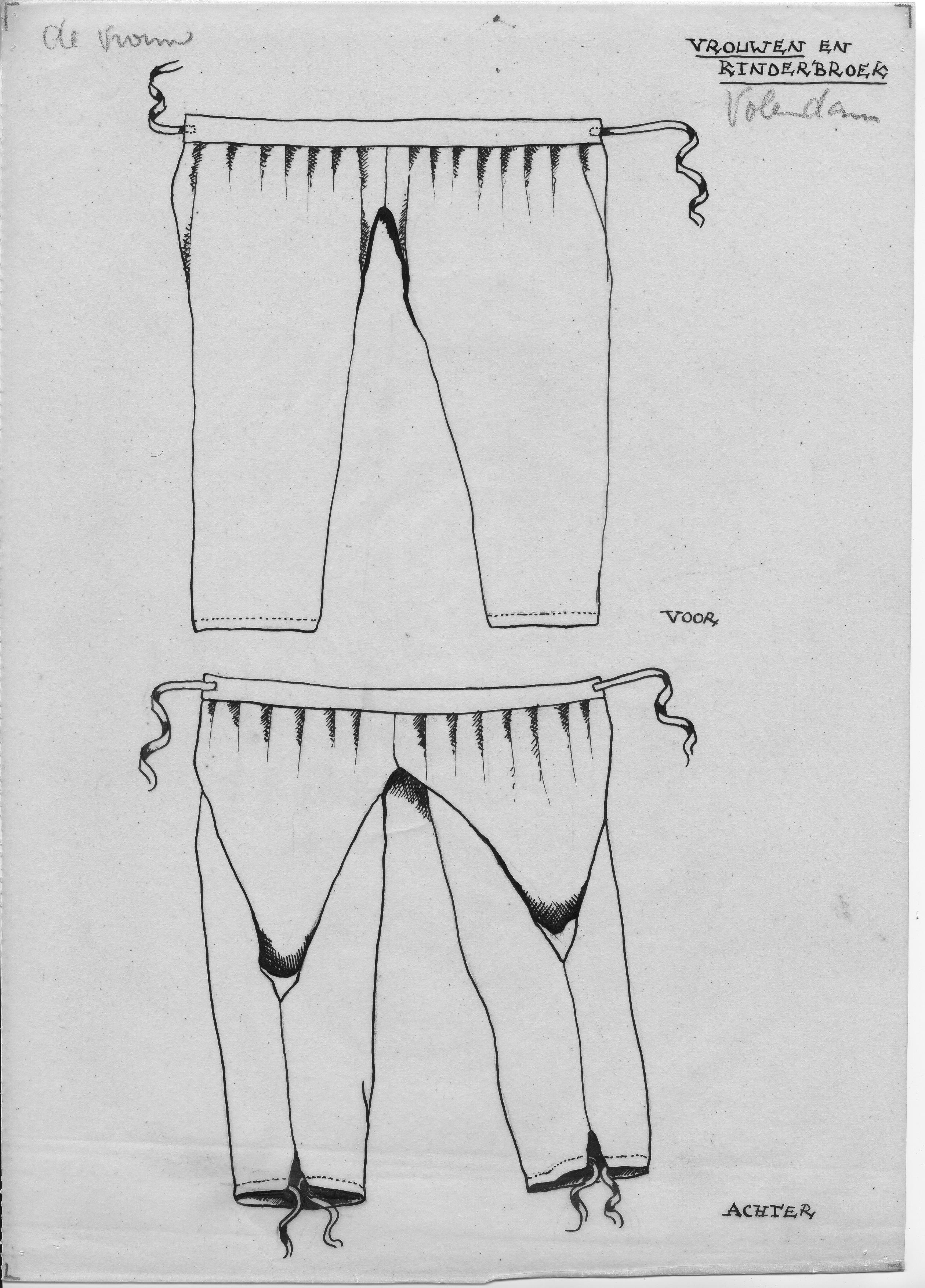 Tekening van de voor- en achterzijde van een vrouwen- en kinderbroek uit Volendam.