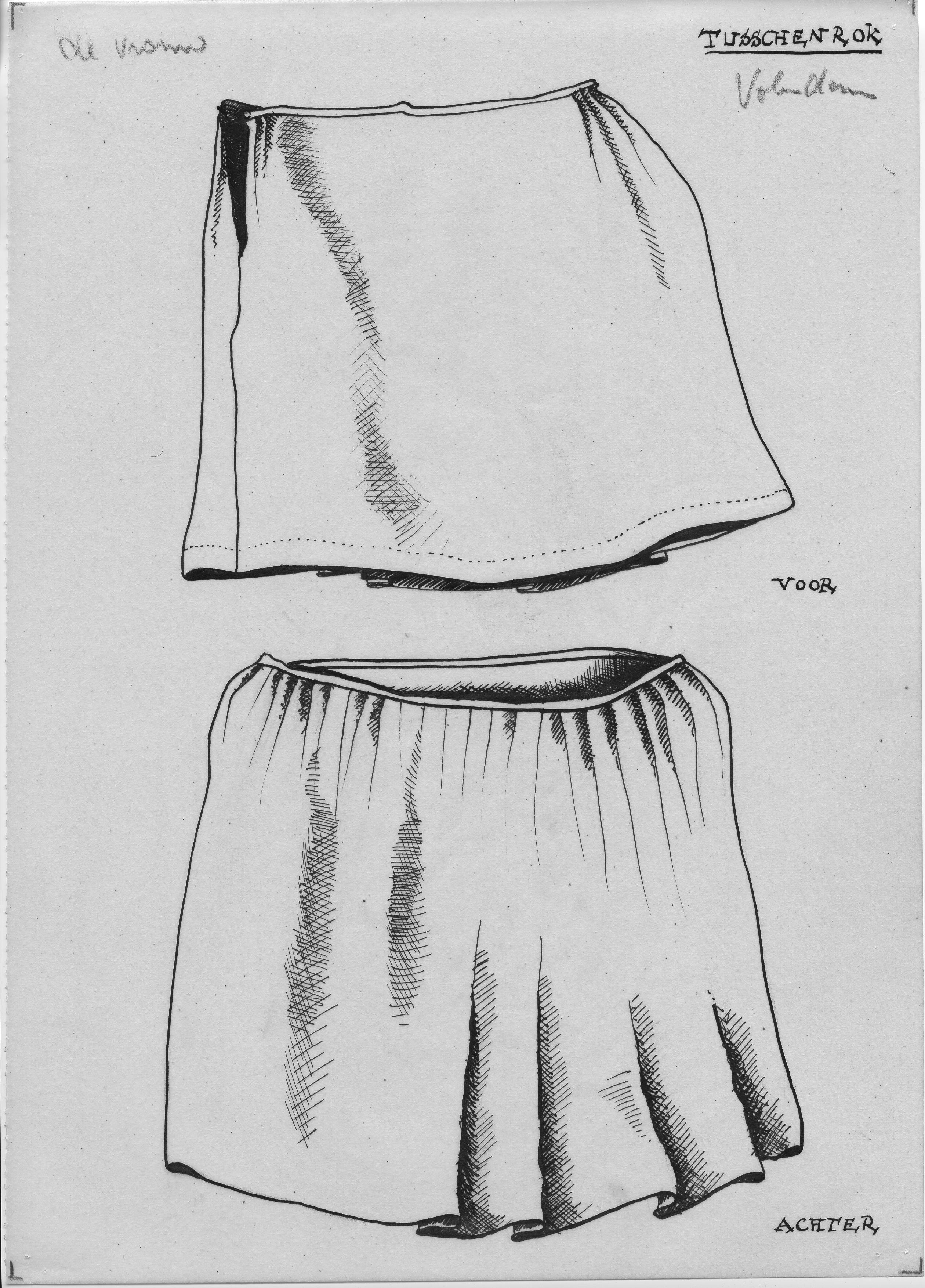 Tekening van de voor- en achterzijde van een vrouwentussenrok uit Volendam.