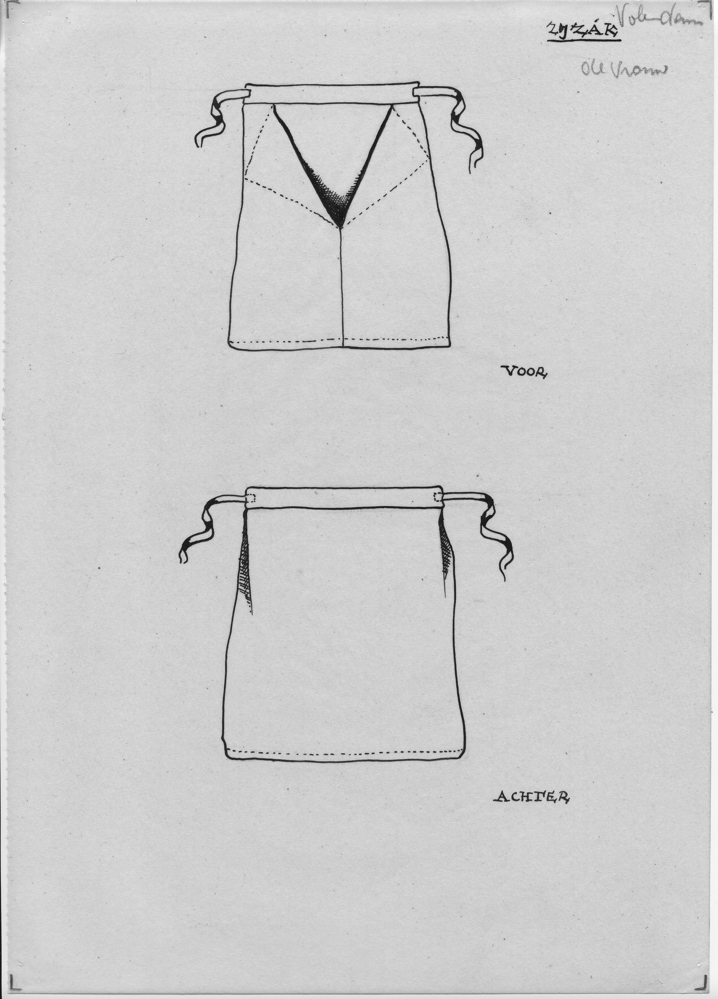 Tekening van de voor- en achterzijde van een vrouwenzijzak uit Volendam.