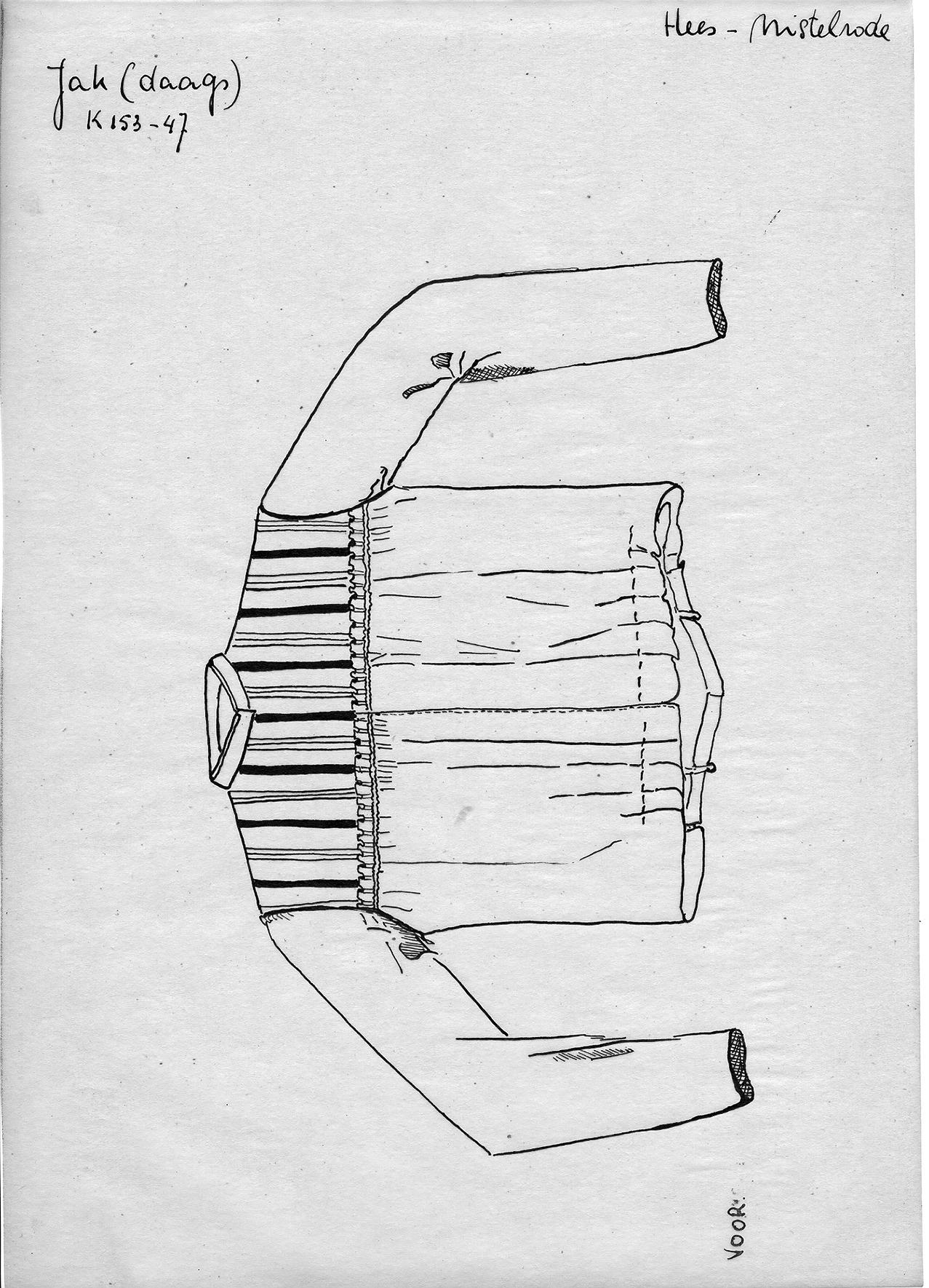 Tekening van de voorzijde van een daags jak uit Heesch en Nistelrode.