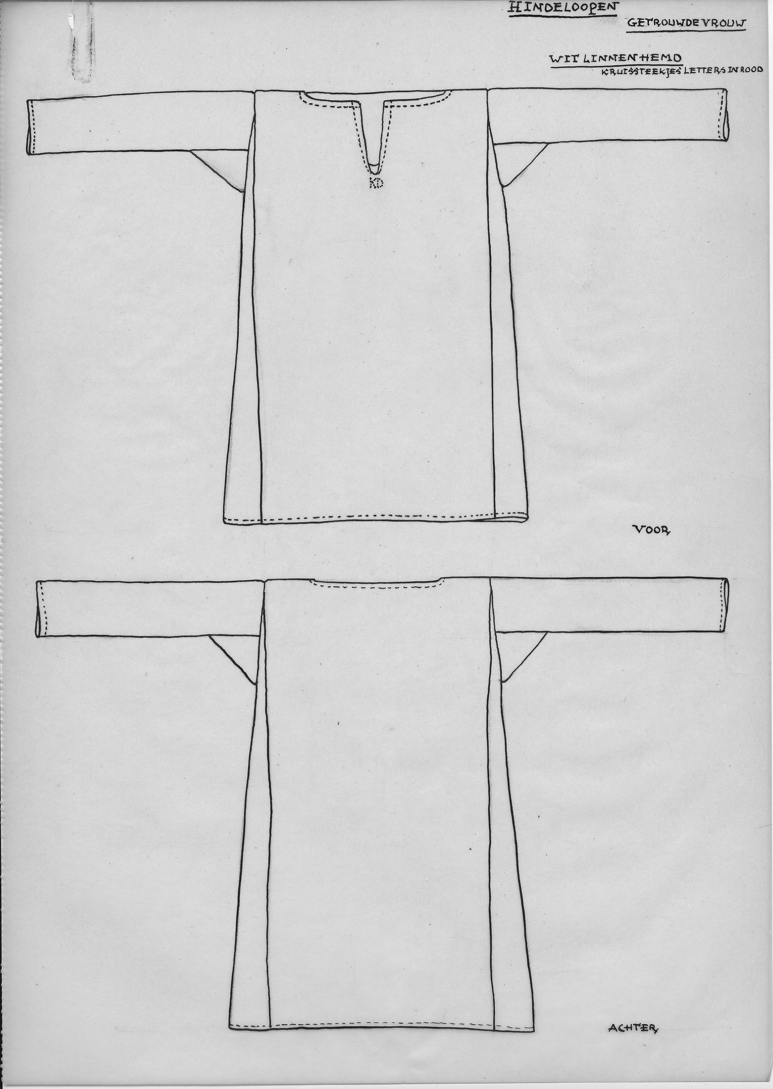 Tekening van de voor- en achterzijde van een wit linnen hemd, gedragen door getrouwde vrouwen uit Hindeloopen.