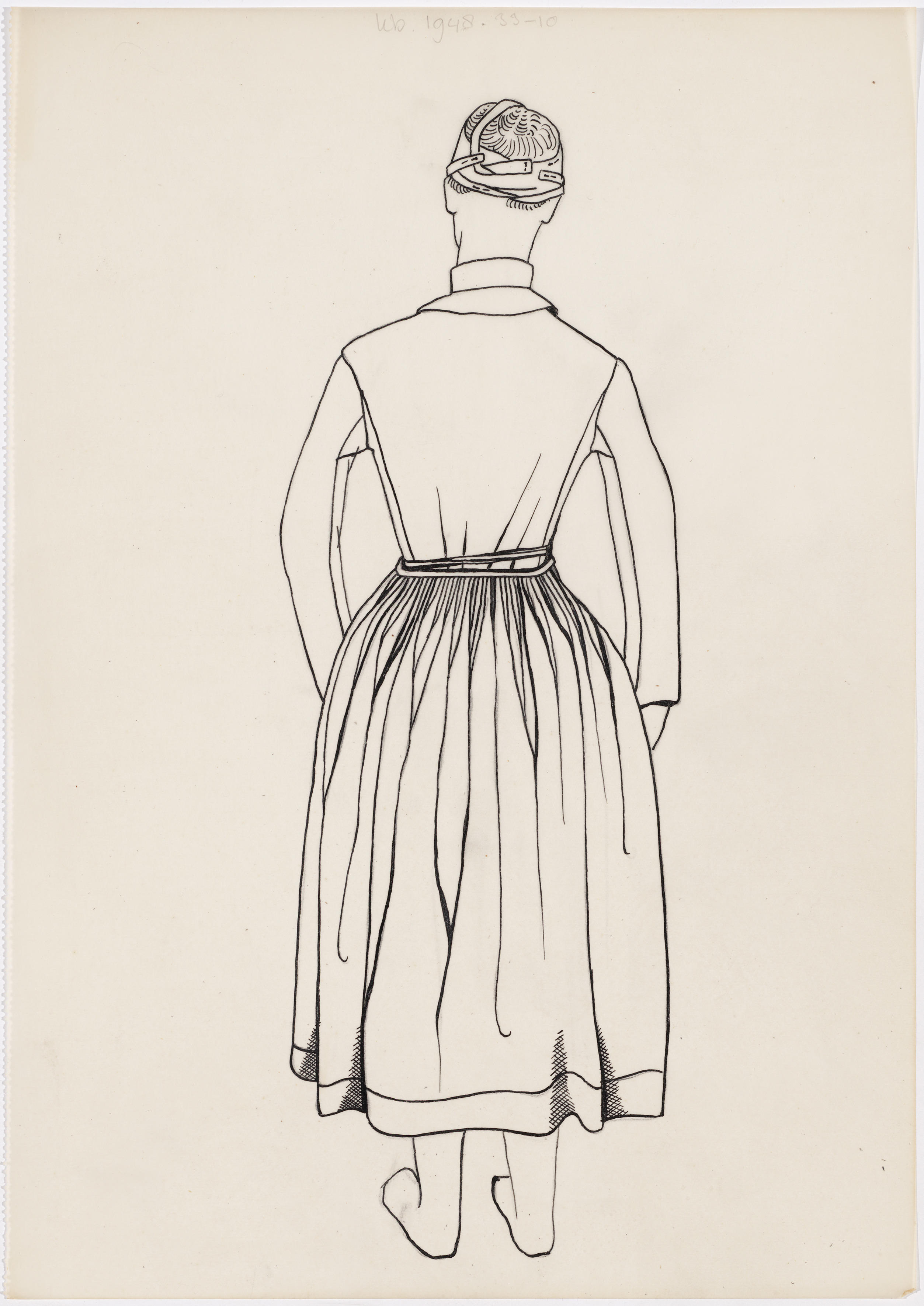 Tekening van de achterzijde van een getrouwde vrouw in de streekdracht van Hindeloopen.