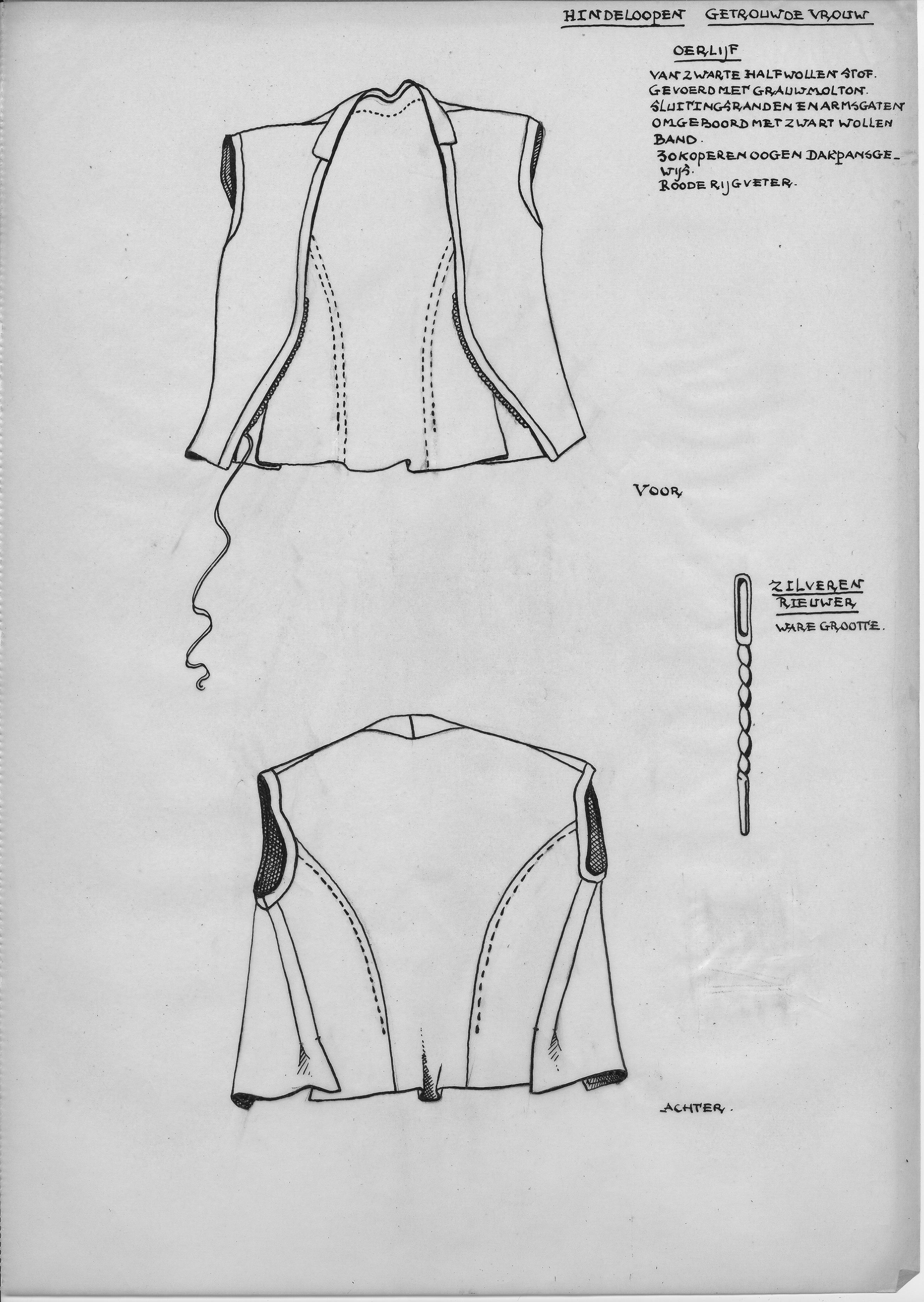 Tekening van de voor- en achterzijde van een oerlijf, gedragen door getrouwde vrouwen in Hindeloopen, en een zilveren rieuwer op ware grootte.