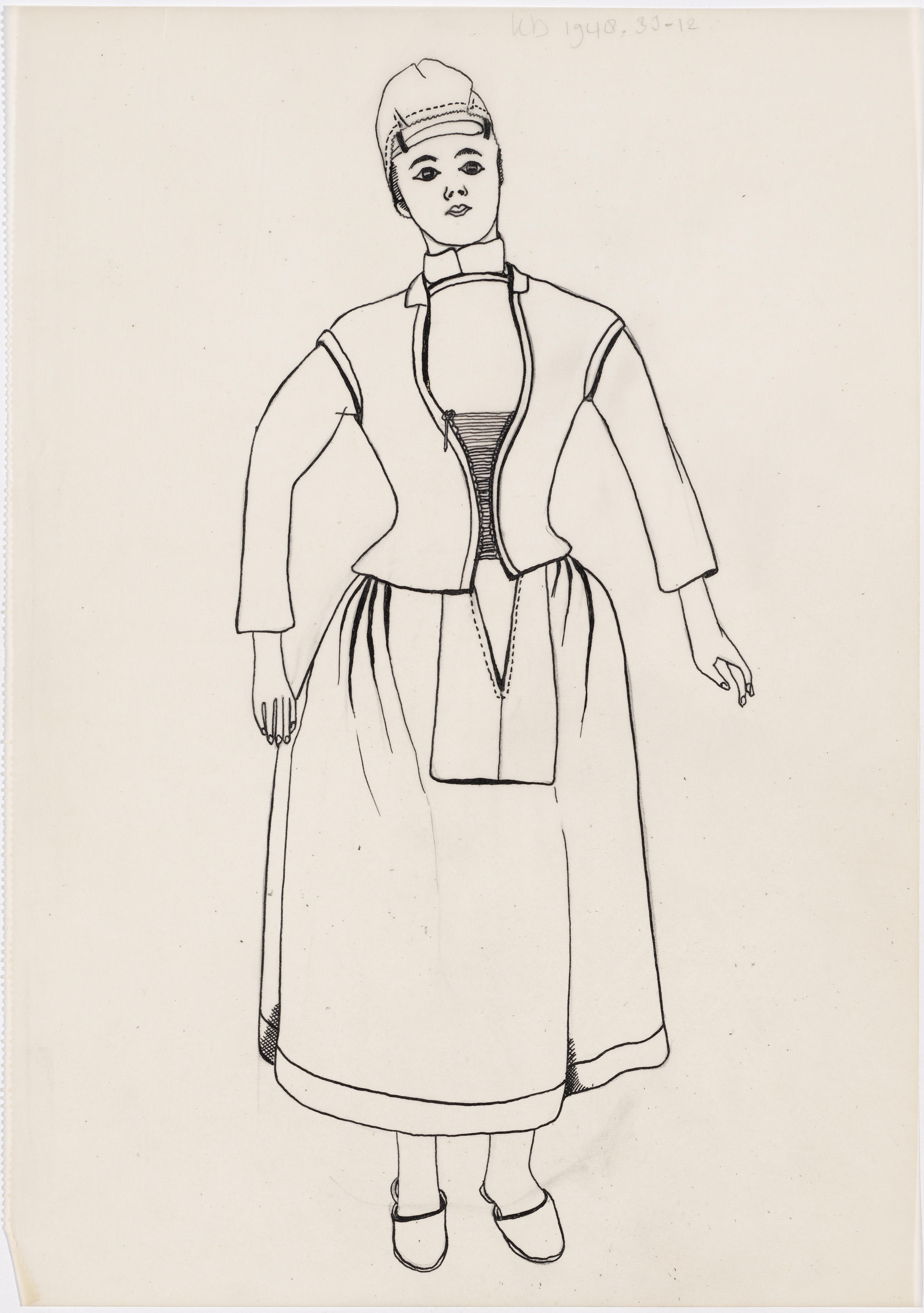 Tekening van de voorzijde van een getrouwde vrouw in de streekdracht van Hindeloopen.