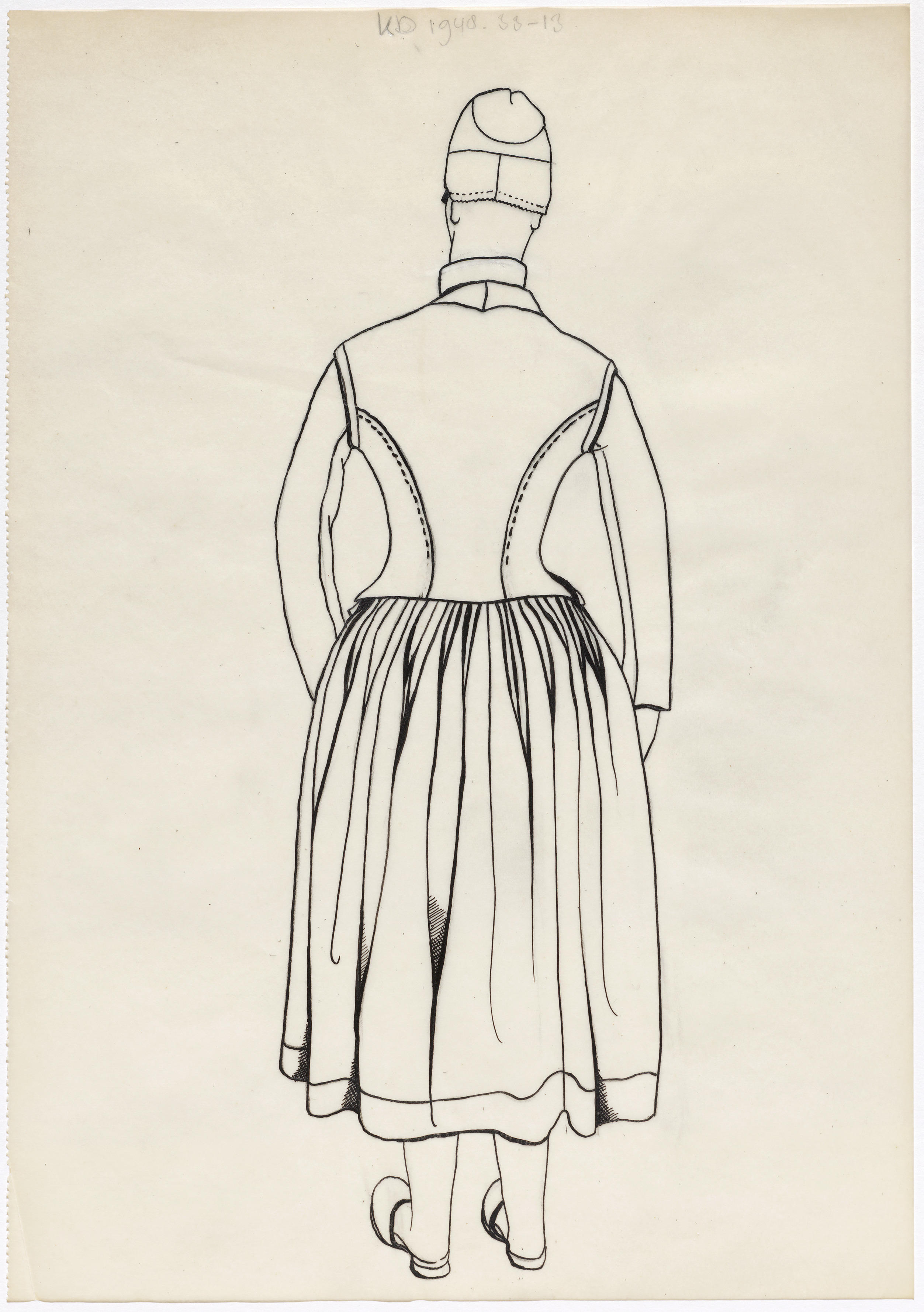 Tekening van de achterzijde van een getrouwde vrouw in de streekdracht van Hindeloopen.