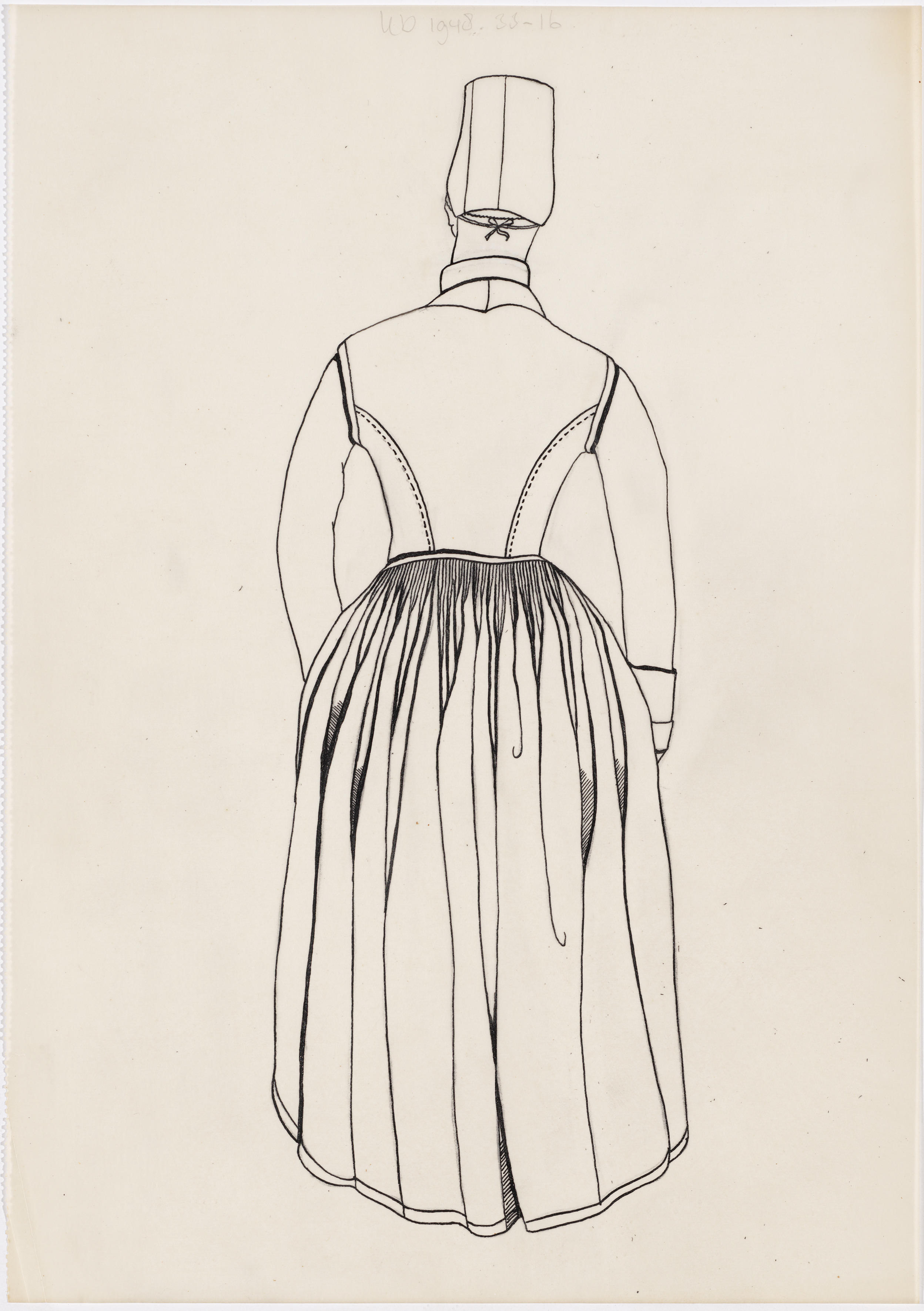 Tekening van de achterzijde van een getrouwde vrouw in de streekdracht van Hindeloopen.