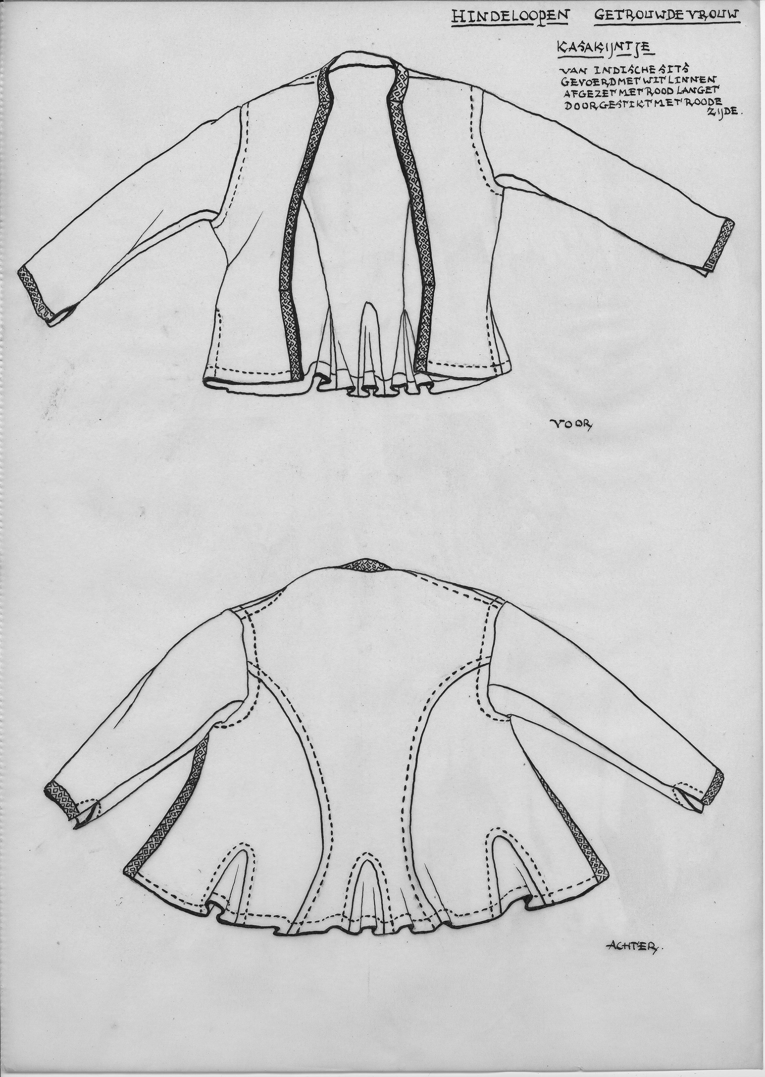 Tekening van de voor- en achterzijde van een kassakijntje, gedragen door getrouwde vrouwen in Hindeloopen.