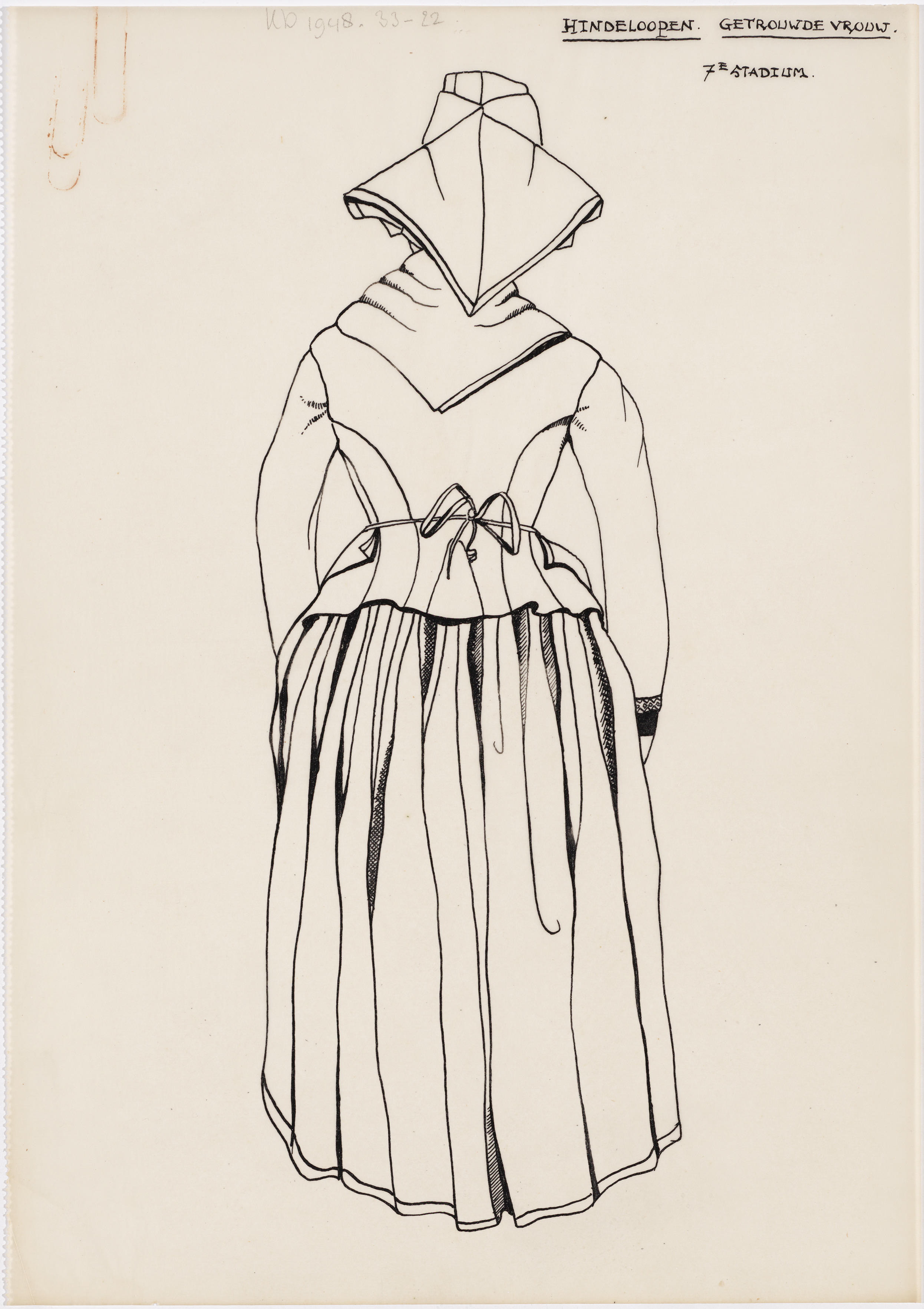 Tekening van de achterzijde van een getrouwde vrouw in de streekdracht van Hindeloopen. Zevende stadium.