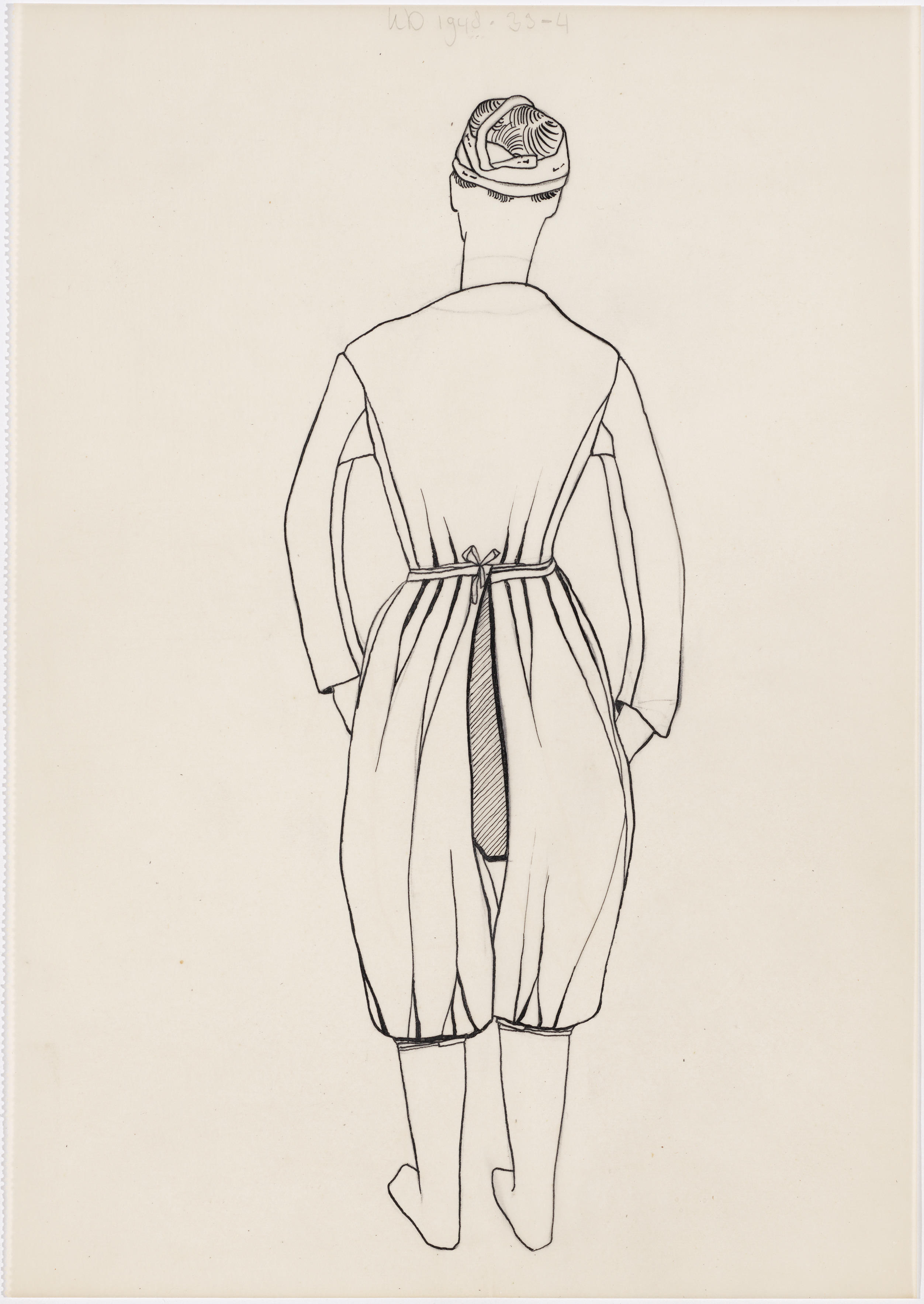 Tekening van de achterzijde van een vrouw in ondergoed in de streekdracht van Hindeloopen.