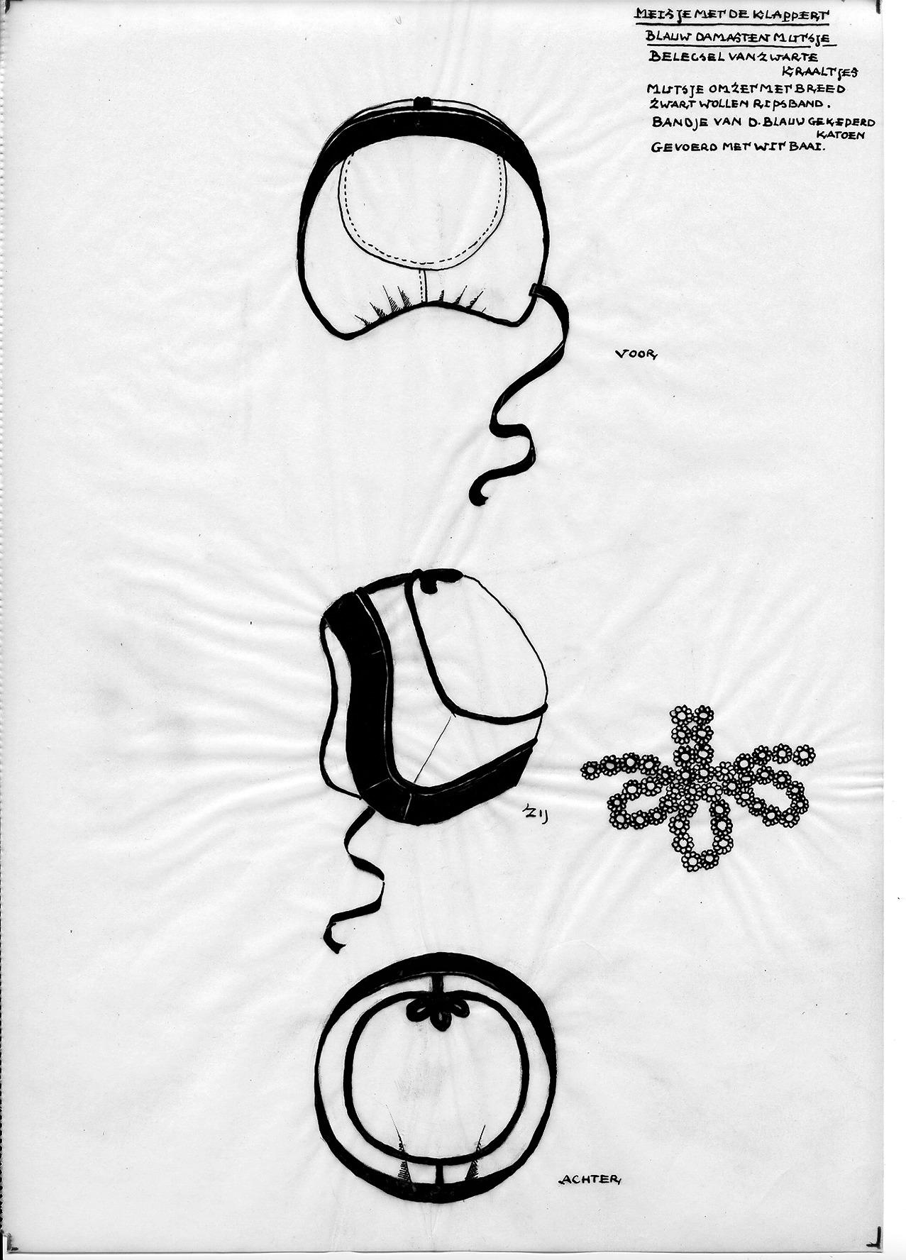 Tekening van het voor-, zij- en achteraanzicht en het belegsel van een blauw damasten mutsje voor het meisje met de 'klappert' uit Hindeloopen. Het belegsel is van zwarte kraaltjes.