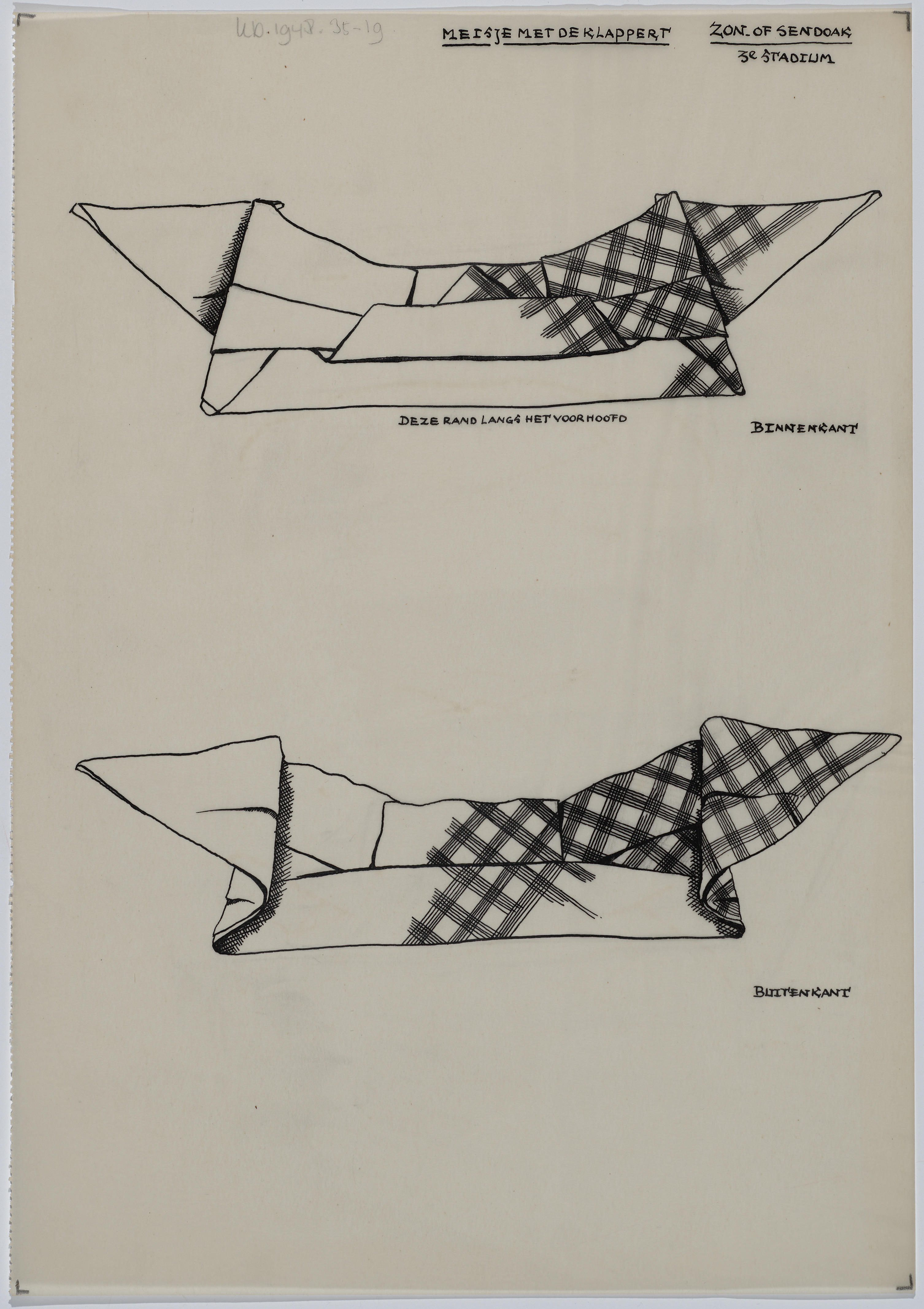 Vouwwijze van de zon- of sendoak voor het meisje met de klappert. Derde stadium van vouwen. De binnen- en buitenkant zijn afgebeeld.