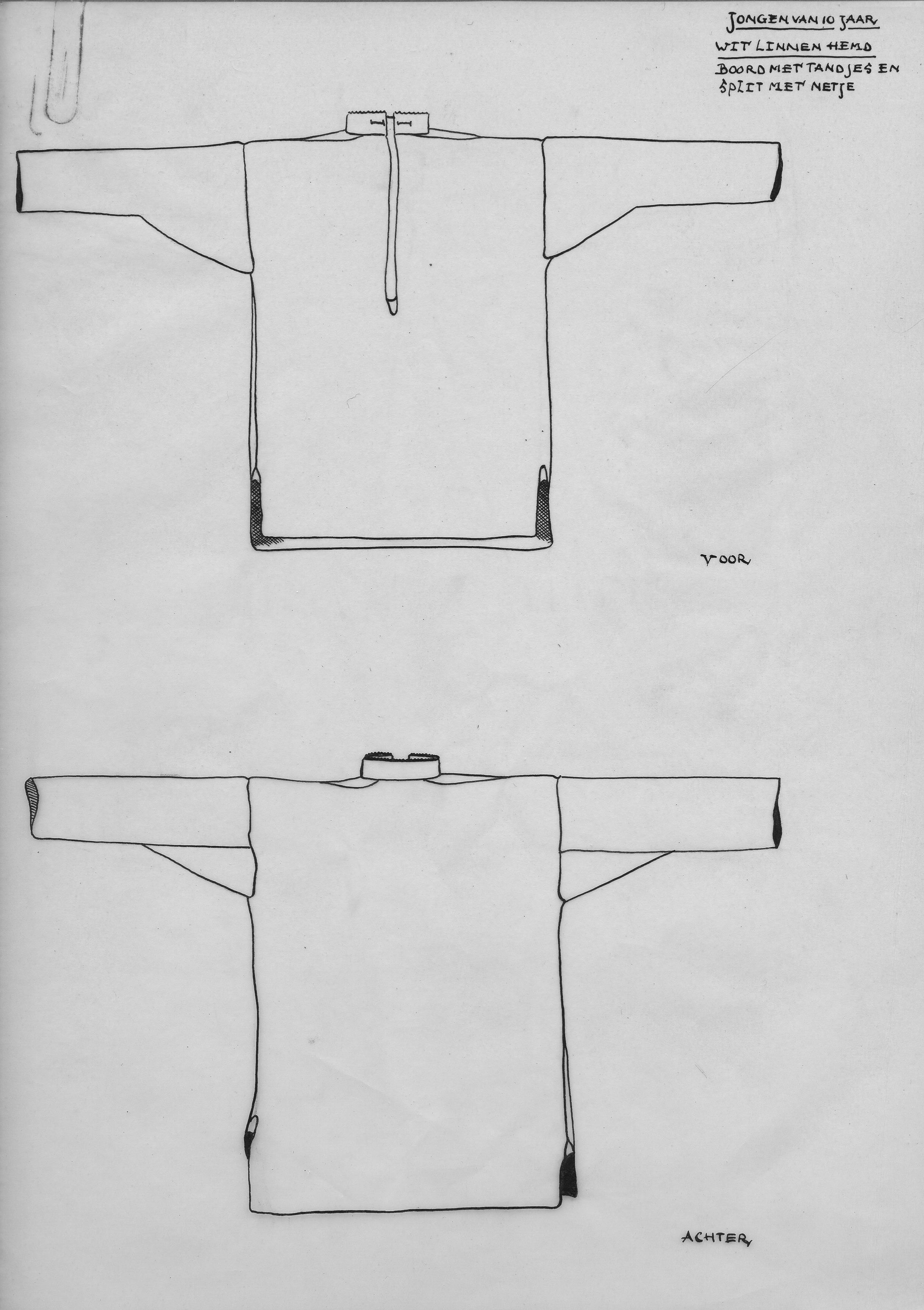 Tekening van de voor- en achterzijde van een wit linnen hemd voor een jongen van 10 jaar uit Hindeloopen. De boord heeft tandjes en het split is met een netje.