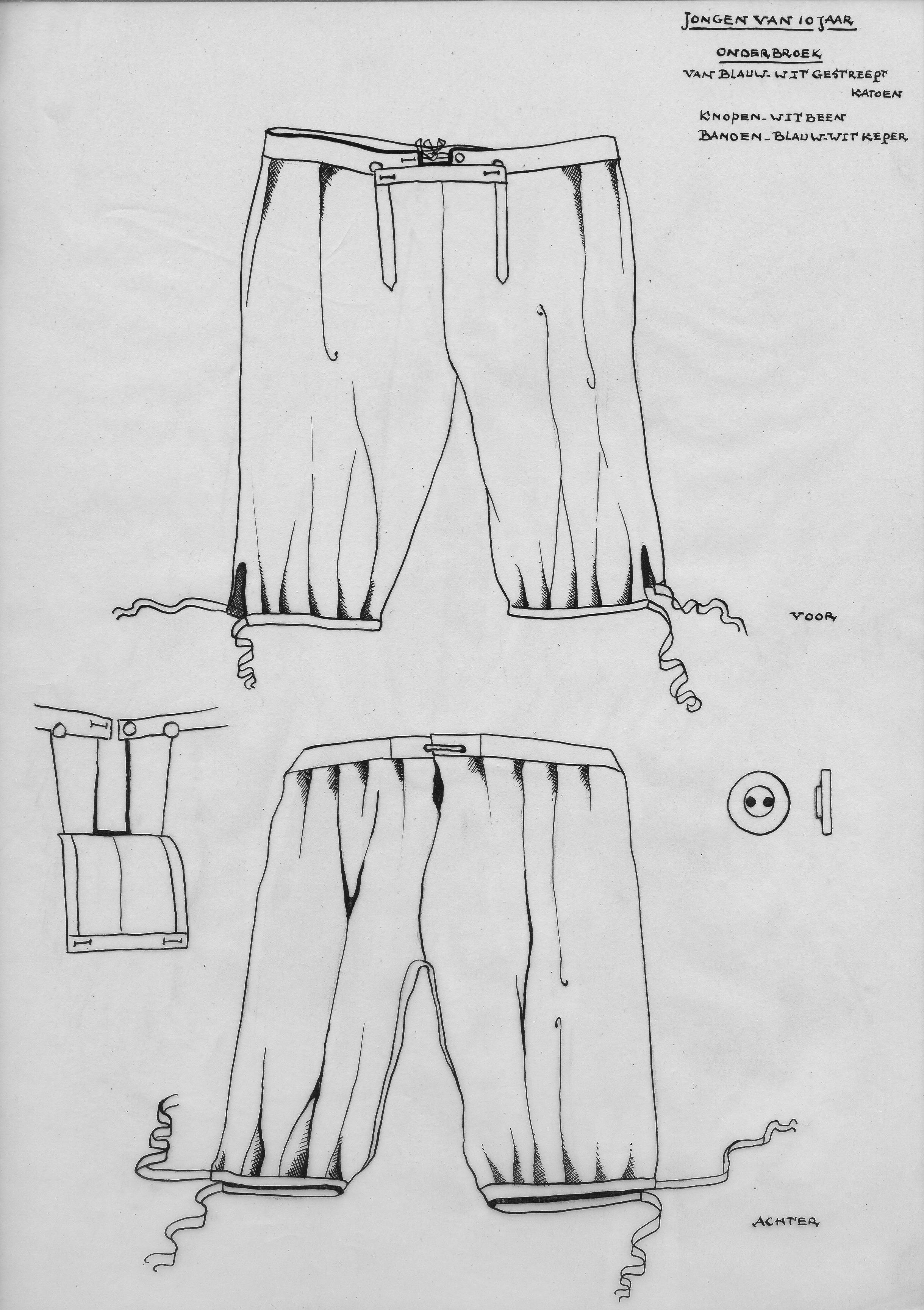 Tekening van de voor- en achterzijde en de details van een onderbroek voor een jongen van 10 jaar uit Hindeloopen. De onderbroek is gemaakt van blauw-wit gestreepte katoen. De knopen zijn van been en de banden van blauw-witte keper.