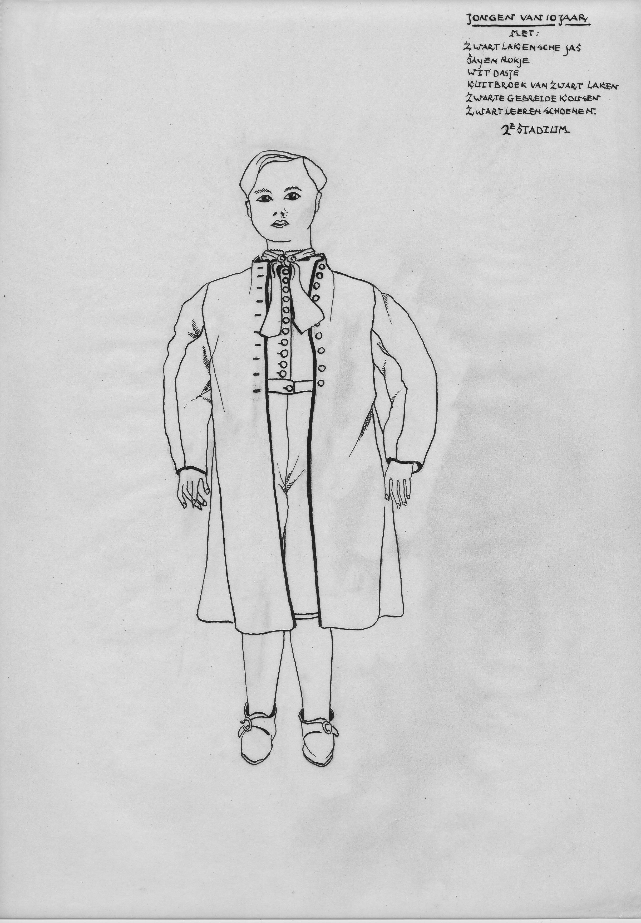 Tekening van de voorzijde van een jongen van 10 jaar uit Hindeloopen in het tweede stadium. Hij draagt een zwarte lakense jas, sayen rokje, wit dasje, kuitbroek van zwart laken, zwarte gebreide kousen en zwart leren schoenen.